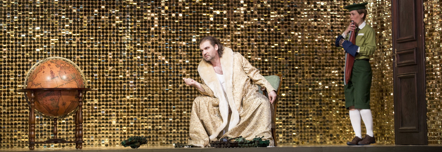 Kasperletheater und goldene Zeiten sind bei Bühne und Kostümen von Timo Dentler und Okarina Peter sowie der Lichtgestaltung von Olaf Lundt wörtlich zu nehmen. Zum einen dirigiert der Adel das Volk von einem überdimensionierten Kasperletheater, das am Ende der Krönungsszene in einer krachenden Implosion zusammenfällt und als beherrschendes Theaterrequisit auf der Bühne lange gegenwärtig bleibt.