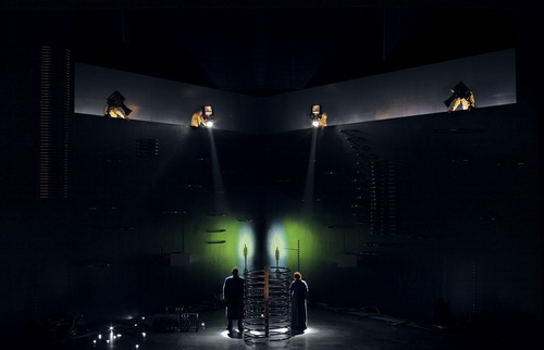 Dem Einfluss Markes können sich die Getreuen des Paars, Brangäne und Kurwenal, nicht entziehen und werden geradezu neutralisiert. Sie spielen in der Inszenierung eine blasse Rolle. Nur dem Einsatz von Christa Mayer ist es zu verdanken, dass sich die Brangäne immerhin noch ansatzweise profilieren kann. Und das Liebespaar selbst braucht sich die Liebe natürlich nicht durch einen mysteriösen Liebestrank „anzusaufen“. Demonstrativ gießt Isolde das Fläschchen aus. Menschen aus Fleisch und Blut erleben wir dennoch nicht. Dafür bleibt die Personenführung zu archaisch und abstrakt. Wenn man von Personenführung überhaupt sprechen kann. Denn das undurchdringliche Labyrinth an Treppen, Aufgängen, Podesten und Aufzügen im ersten Akt engt den Bewegungsfreiraum der Figuren nahezu vollständig ein. Das Bühnenbild von Frank Philipp Schlößmann erinnert entfernt an eine Schiffstakelage, in der die Figuren wie in einem streng konstruierten Spinnennetz zappeln. Und das in einer matt ausgeleuchteten Dunkelkammer in Kostümen, die sich farblich nur wenig vom düsteren Hintergrund abheben.
