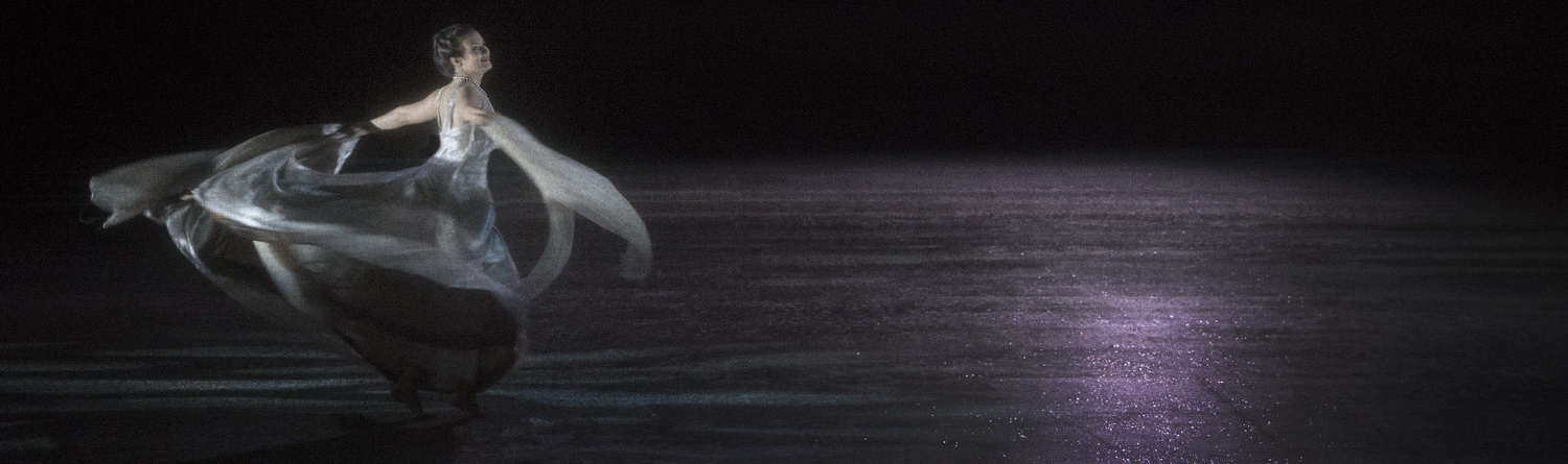 Wim Wenders und sein Bühnenbildner David Regehr haben sich entschlossen, erstmal jeglichen exotischen Kitsch wegzulassen. Die leicht schräge Bühne ist vollkommen lehr, bis hin zu den Brandmauern. Lediglich wallende, bodenlange, graue Seidenvorhänge sind Wellen, Wind und Schutz zugleich. Die Stummfilm-Ästhetik der schwarz-weißen Filmeinspielungen geben dem Drama eine gewisse Dreidimensionalität und illustrieren die flashbacks der Geschichte – die Pilgerreise der beiden Freunde, die Begegnung mit der unbekannten Schönen, die Rettung des verfolgten Zurga durch Leila. Und immer wieder die Wogen der Wellen, die Götter, die es zu besänftigen gilt. Die Lichtregie von Olaf Freese ist absoluter Bestandteil der minimalistischen und intimen Atmosphäre der Bühne. Mal greller Spot auf die beiden Liebenden, mal sanfte Caspar-David-Friedrich-Ausleuchtung einer Wolke, mal Sandstrandspielwiese für den Chor.