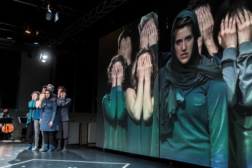 Schubert erklingt nicht nur im Original, sondern verfremdet und in delikaten Neuarrangements durch den Gitarristen Tobias Weber. Parallel zu den Aktionen, in die auch die Instrumentalisten – das Apollon Musagète Quartett, Weber selbst und der Pianist Matan Porat– miteinbezogen sind, werden die Gesichter der Darsteller vergrößert auf zwei bewegliche Leinwände projiziert. So entsteht eine besondere Nähe zum Publikum. Jede Musiknummer trägt eine moderne Überschrift. Gretchen am Spinnrade heißt beispielsweise U‑Bahn-Gretchen. Dabei kauert Sarah Laulan als Flüchtlingsfrau inmitten einer Menschengruppe und singt „Meine Ruh ist hin“. Oder Meeres Stille mit dem Übertitel Lampedusa: Während Julla von Landsberg das Lied ganz zart vorträgt, simuliert das Ensemble durch Körperbewegungen Wellen. Sehr aktuell wirken diese Bilder, aber nie aufgesetzt.