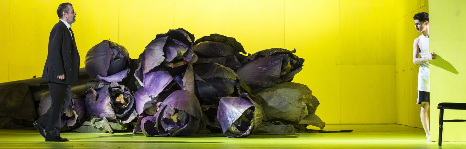 Der in der fein-abgestuften Lichtregie von Wolfgang Göbbel in der morbiden Farbmischung von Gelb- und Lilatönen gehaltene Einheits-Bühnenraum ist ausgefüllt durch einen riesigen schwarzen Bilderrahmen und einen übergroßen lilafarbenen Tulpenstrauss als suggestive Schmuckelemente einer Totenfeier. Diese Bilder bleiben während der gesamten Handlung dominant. Der in der Novelle 50-jährige Aschenbach kann ihnen nicht entfliehen. Er kann seinem von Anbeginn unausweichlichen Weg in den Tod nicht entkommen.