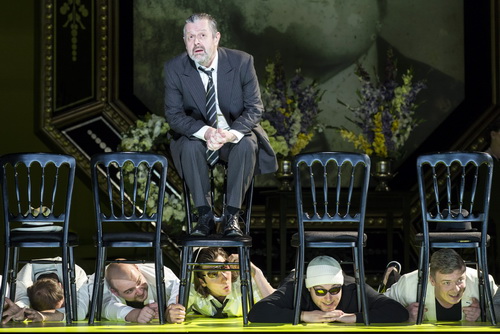 Graham Vicks Inszenierung von Brittens Spätwerk fokussiert auf den Tod des Dichters Aschenbach – und dazu braucht er beim ihm nicht bis Venedig zu reisen. In der Ausstattung von Stuart Nunn sind die großen, raumgreifenden Symbole einer Beerdigungsszene mit Trauergemeinde zu sehen, jedoch über den gesamten Abend keine spezifisch Venedig zuzurechnenden Bildelemente.