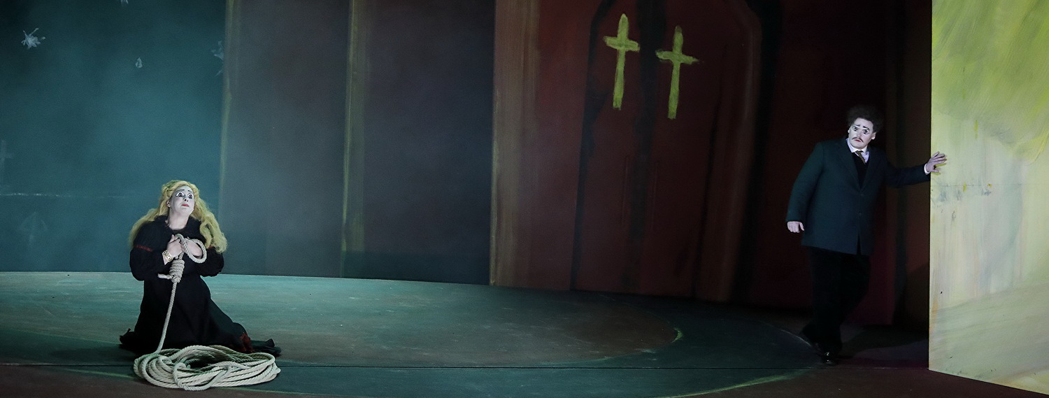 Nigel Lowery konterkariert mit seinem holzschnittartigen Karikaturenkonzept die tiefgründige Melodik Gounods. Mehr noch als die comichaften Tableaus, ist es die Puppenhaftigkeit der Protagonisten, die mit ihren zum starren Blick geschminkten Augen jegliche Leidenschaft vermissen lassen. Hier hilft die Dramaturgie von Katja Bury nur bedingt weiter, auch eine durchaus agile Personenführung bringt das Leiden in diesem Drama nicht authentisch zur Anschauung. Die Vision von Lowery bleibt vielmehr in der Karikatur haften und entgleist im Divertissement mit der Walpurgisnacht unfreiwillig auf die alberne Schiene im Stil einer britischen Comedy. In dem Maß, wie der leere Ausdruck in den Augen der Darsteller irritiert, erreicht einen die dramatische Partitur des französischen Meisters nicht. Die Musik prallt eigentümlich ab, wo sie doch für andächtiges Schaudern sorgen sollte.
