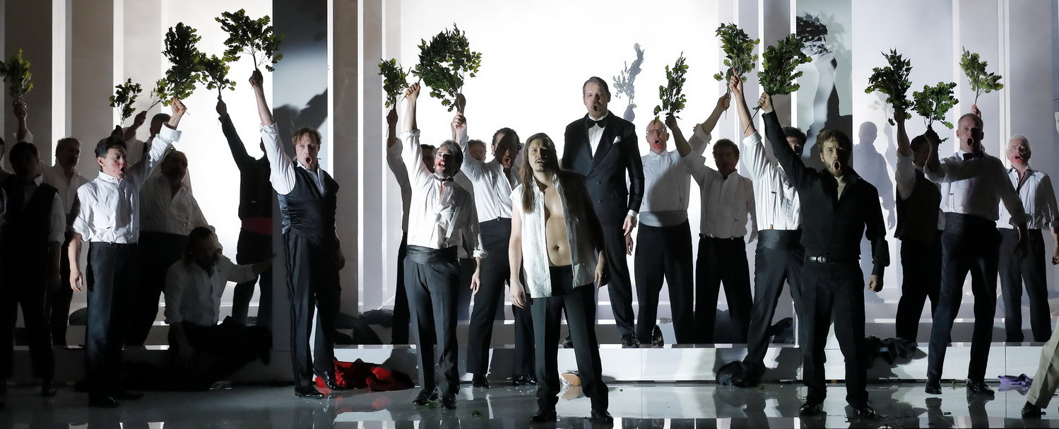 Ebenso präzis und stringent geht es weiter im zweiten Akt. Die Bühne von Rebecca Ringst und das Licht­design von Michael Bauer schaffen einen schlüs­sigen Übergang vom wilden Dschungel in eine vorder­gründig domes­ti­zierte Welt. Ein mit Schein­werfern überblen­detes Tableau illus­triert den sterilen Kontra­punkt zum leben­digen Wald mit seinen Gefahren. Der ungezähmten Natur stellt der Regisseur ein weißes Säulen­kon­strukt gegenüber. Klare Formen trotzen den unheim­lichen Urtrieben. Die Mitglieder dieser sekten­ähn­lichen Gemein­schaft haben ihren festen Platz im Gefüge. Die Kostüme von Ingo Krügler setzten diesen Kontrast gleichsam überzeugend um. Auf das Outdoor-Outfit im Wald folgt der Status­schick der Upper­class. Zum Sänger­wett­streit erscheint die Haute­volee sogar in Haute-Couture. Bei der Büßer-Szene im Finale des zweiten Akts überbordet dann Bieitos Lesart. Der Künstler scheint für einen Moment in seine expressive Zeit als Skandal­re­gisseur abzugleiten. Wenn Tannhäuser vor seinem Gang nach Rom von den Sänger­freunden mit einem geweihten Zweig gewaltsam traktiert wird, konter­ka­rieren die deutlich hörbaren Peitschen­hiebe die epochale Tondichtung des deutschen Romantikers.
