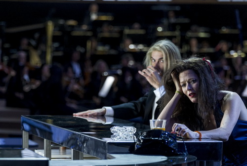 Von dort hat man dank Guéguin einen vielseitigen Blick auf die Protagonisten. Mit Hilfe von verschiedenen Kameras kann er einzelne Bühnenteile auf eine rückwertige Leinwand projizieren. In Schwarzweiß-Optik ist hier ein Krimi im Krimi zu sehen, eine weitere Ebene im Psychogramm und ein Einblick in die Mimik der Sänger, die man von den hinteren Plätzen nur erahnen kann. Aber gespielt und – das muss man direkt dazu sagen – auch gesungen wird mit höchster Intensität. Allen voran muss hier Barbara Hannigan genannt werden, bei der man vergisst, dass geschauspielert wird, und auch, dass man nicht nebenbei singt. Es klingt alles so leicht, so echt, wie sie fast sprechend Antworten gibt, wie ihr Sopran mühelos durch die Musik zu schweben scheint. Gleichzeitig formt sie diesen zerrissenen, von Beginn an zerstörten Charakter.