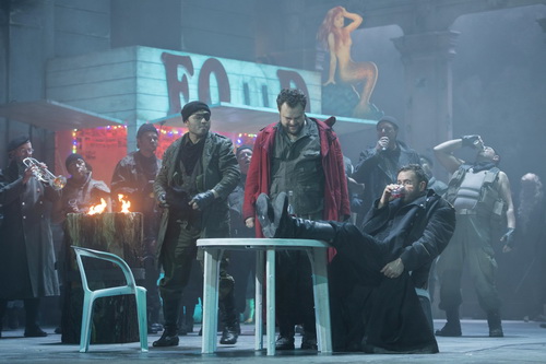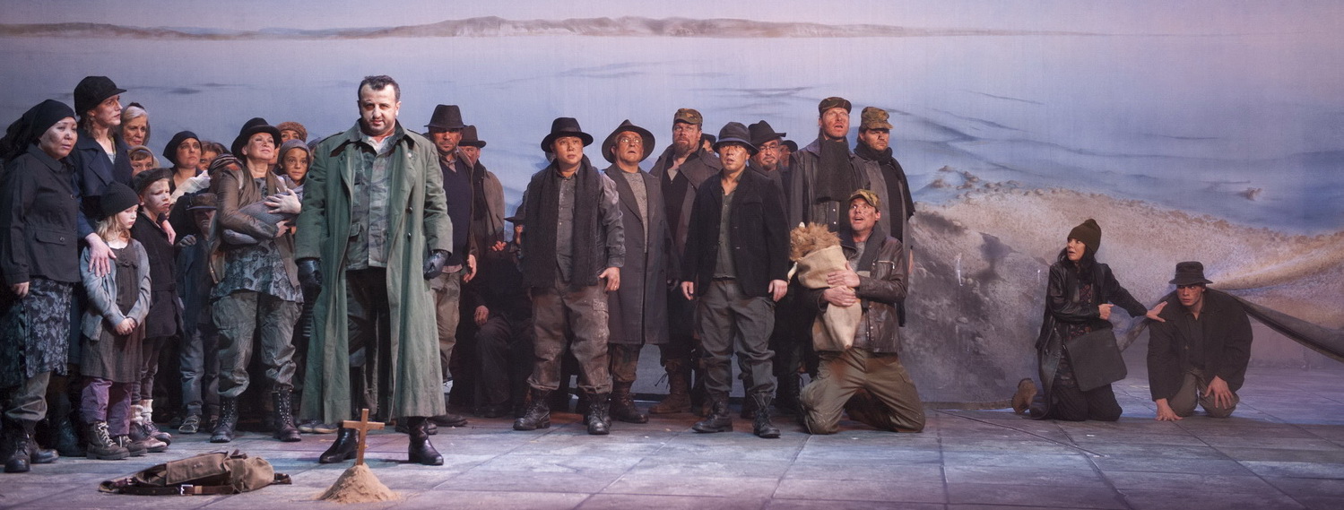Schau­plätze des Dramma lirico sind das Zentrum des udine­si­schen Aquileia, eines Vorläufers Venedigs, und diverse Lager der umher­zie­henden Hunnen wie der bedrängten Römer. Diese entfernt an Bellinis Norma erinnernde, vergangene Welt ist freilich Dietrich W. Hilsdorfs Sache nicht. Der Regisseur, der einmal mehr mit seinem Team, dem Bühnen­bildner Dieter Richter und Kostüm­spe­zia­listin Renate Schmitzer, zusam­men­ar­beitet, verlegt das Ganze in eine Moderne, die sich auch als unsere Gegenwart entschlüsseln ließe. Friede ist wie zurzeit in Nahost nirgends. Richter hat einen in der Höhe imposanten Raum geschaffen, der vergangene Schlachten und die Gegenwart von Folter und Ermordung geradezu atmet. Das ist durchaus auch wörtlich gemeint. Über der Szene, in der es von Soldaten mit Gewehren nur so wimmelt, liegt ständig ein Gemisch aus Ruß und Rauch, deren Summe Fachleute wohl als Feinstaub definierten. Ein Umstand, den ein Teil des Publikums mit manchem Husten­anfall quittiert. Was nicht der Qualm des Krieges geschwärzt hat, ist bunt und grell gehalten. Ein ambulantes Bistro mit Pasta- und Vino- Service sowie TV-Geflimmer verrät ebenso wie ein Pulk von Marke­ten­de­rinnen eine Infra­struktur an Betreuung der Soldaten. Unter­haltung muss sein, während auf einer als Lager­statt ausge­klei­deten Extra-Bühne die Folter­opfer darben und Leichen herum­liegen, weil mutmaßlich der Abtransport nicht organi­siert ist.