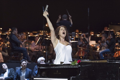 Oberflächlich betrachtet, haben sich der ausgewiesene Theaterprofi Konwitschny, inzwischen 72-jährig, und sein Ausstatter Johannes Leiacker bei der Umsetzung des knapp eineinhalbstündigen Einakters für eine Konzeption entschieden, die als semi-konzertant umschrieben werden könnte. Keine Kulissen oder Requisiten, ein schwarzer Hintergrund statt eines Bühnenbildes, auf der vorderen Bühne eine weiße Aktionsfläche, die den Orchestergraben zudeckt, darauf postiert die beiden sattschwarzen Konzertflügel, die auch in wechselnde Positionen gerollt werden können. Schließlich das im Bühnenhintergrund auf einem Podest platzierte Orchester. Der Eindruck prima vista täuscht indes gewaltig. Leitmotiv der Inszenierung ist die Adaption des antiken griechischen Theaters und damit die Abkehr von der Bühne im Stil der Frontalpräsentation. Einige Zuschauer sind links und rechts von der Spielfläche platziert, Teile des Chors und die solistischen Chorsänger in den ersten Parkettreihen, von denen aus sie in das Geschehen eingreifen. So formt sich das Ganze zu einer Arena, in der das Publikum wie beim Wrestling direkt dem Spektakel folgen und Anteil nehmen kann. Alle Sängerdarsteller bewegen sich in Kleidung von heute, was den Eindruck eines Dramas in der Gegenwart hervorruft. Unsere Zeit gilt bekanntlich als schnelllebig. Ständige Bewegungen und ein hohes Tempo in den Aktionen setzen hier an, verstärken das Gefühl einer existentiellen Verunsicherung beim Betrachter, dem wenig Raum gegeben wird, bloß zu konsumieren. Die Handlungsströme kulminieren auf, unter und neben den beiden Flügeln, auf denen die Existenzkämpfe der Geschlechter ausgetragen werden. Sie avancieren symbolisch zu einer Empore der Kunst, in der die Gesellschaft bevorzugt das zum Thema macht, was der politische Diskurs verfehlt oder ausblendet.
