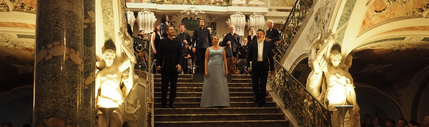 Andreas Spering hat das Festival 2002 im Rahmen der Brühler Schlosskonzerte gegründet. Er steht auch in diesem Jahr, wie es schöne Tradition ist, am letzten Tag des Festivals am Pult auf dem Podest des Treppenhauses. Eine Treppe führt dort hinauf. Zwei seitliche Treppen bringen den Besucher in das obere Geschoss, wo sich der Rokoko-Glanz fortsetzt. Aus Sicht des Publikums auf den ersten Blick eine unmögliche Spielstätte. Egal, wo man sitzt, vielleicht mit Ausnahme der ersten Sitzreihe der oberen Galerie, hat man ein eingeschränktes Sichtfeld. Und tatsächlich sind hier die teuersten Sitzplätze immer als erste verkauft. Wenn, wie heute Abend, überhaupt Sitzplätze frei bleiben. Denn wer sich auskennt, weiß, dass die Akustik dieses Treppenhauses wirklich überwältigend ist. Und es ist völlig egal, wo man sitzt. Aber wenn man schon das Glück hat, einen Platz zu bekommen, von dem aus man einen Blick auf die Sänger hat, wäre es schön, sie auch erkennen zu können. Hier hat die Lichttechnik schlicht gepatzt.
