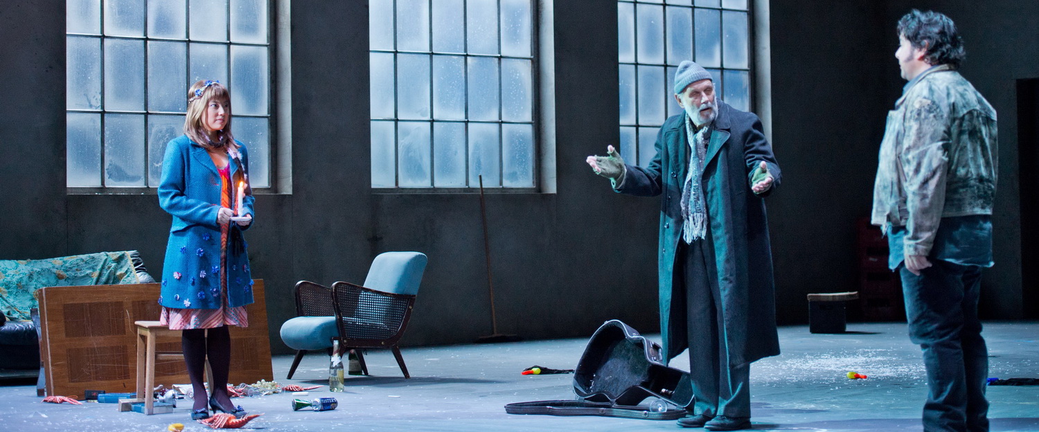 Herzog inszeniert das Stück aus der Perspektive des gealterten Rodolfo, der wie ein grauer Greis über die Bühne schleicht. Der wird Zeuge einer nur beiläufig inszenierten Romanze mit etlichen logischen Brüchen und wenig Atmosphäre, weil den Regisseur die politischen Ambitionen der abgerissenen Künstlercrew viel mehr interessieren. Die jungen Leute lässt Herzog zu 1968-er-Protestlern mutieren, die mit Che-Guevara-Plakaten hantieren, die die billige Pommes-Bude des Café Momus im zweiten Akt besetzen, die Kasse plündern und Musetta wie eine Libertà auf dem Dach posieren lassen, bevor sie von der Gendarmerie zusammengeknüppelt werden. Vor der toten Mimi am Ende flüchten sie alle kopflos, bis auf den erschütterten Greis. Völlig unpassende, ablenkende und in die Irre führende Zutaten. Es wäre sinnvoller, den albernen Studentenulk im ersten und letzten Akt origineller und hintergründiger zu inszenieren. Letztlich geht es um ein Stück, bei dem der Tod brutal in eine jugendliche Welt einbricht, die die Zukunft noch vor sich haben sollte.