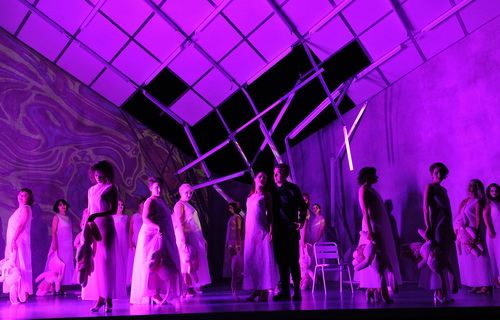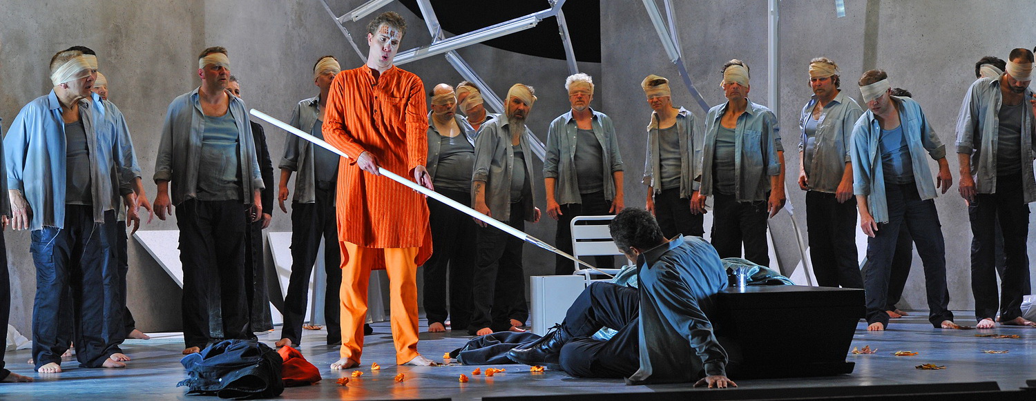 Dass dieser Zustand beschädigt ist, zeigt Regisseur Jakob Peters-Messer zusammen mit seinem Bühnenbildner Guido Petzold. Alles findet drei Aufzüge lang in einem ruinösen Raum statt – er soll an eine ausrangierte, abgewrackte Tiefgarage erinnern – das Dach weist Lücken auf, Dachplatten liegen herum, die Streben sind teilweise verschoben, die nackten Betonwände sind schief. Hier tagt eine verschworene Gemeinschaft sauberer, steril grau, etwas militärisch gekleideter Männer, die Gralsritter, vom Aussehen her gleich, ohne irgendwie individuelle Unterschiede. Gurnemanz in langem, schwarzem Mantel leitet die Versammlung dieser lustfeindlichen Gesellschaft. Sie bereiten sich vor auf ein feierliches, irgendwie aber freudloses Ritual, die Enthüllung des Grals, von dem sie sich Erlösung erhoffen. Als der Gralskelch endlich gezeigt wird, scheinen alle wie in Trance verfallen, wie von Drogen berauscht; dieses Bild erinnert an eine Sekte. Ihre Anführer, Titurel und Amfortas, sind körperlich wie seelisch beschädigt; der eine, ein blinder, uralter Greis, wirkt senil, der andere, ihr König, leidet an einer immer wieder aufbrechenden Wunde und Schmerzen, die ihm zugefügt wurden, als er sich im Kampf um den Heiligen Speer verwundete. Anlass dazu war sein sexuelles Begehren, was für die dem Zölibat verpflichteten Gralsritter verboten ist. Sein Gegenspieler Klingsor hat sich mit dem Speer selbst kastriert, um sich gegen seine sexuellen Gelüste zu wehren, hat aber nun den Speer in seinem Besitz. In der Inszenierung stellen beide quasi die beiden Seiten derselben Person dar und werden konsequenter Weise auch vom selben Sänger verkörpert; beide sind also Opfer einer widernatürlichen Lebensweise. Da hier nur Vorstellungen und Ideen vorgeführt werden, benötigt man kein konkretes Ambiente; alle drei Aufzüge spielen in demselben kaputten Umfeld. Lediglich farbig wechselndes Licht und Projektionen auf die linke Wand sollen eine andere Stimmung und Situation imaginieren. Öfter sind da riesengroß der Kopf Wagners zu sehen, aber auch abstrakte Muster, Schlieren oder unwirklich scheinende Naturphänomene. Leider ist die Stringenz vieler solcher Bilder nicht immer klar. Dass die Blumenmädchen in Klingsors Garten eine Art willenlos kindischer Geschöpfe sind, zeigt sich an ihren schlicht weißen, irgendwie Unschuld signalisierenden durchsichtigen Gewändern und dass sie auch seltsamer Weise rosa Spielhasen mit sich schleppen. Im dritten Aufzug jedoch scheinen sie sich emanzipiert zu haben; sie sammeln beim Karfreitagszauber totes Laub auf und tragen es weihevoll schreitend wie in einer Demonstration für das Leben weg. Die Veränderung Parsifals ist auch äußerlich zu sehen: Ausstatter Sven Bindseil lässt ihn anfangs als Jungen im hellen Kapuzenpulli auftreten, im zweiten Aufzug kommt er in schwarzen Gewändern daher, und im dritten erscheint er zuerst wie ein Gotteskrieger mit schwarz verhülltem Kopf; als er aber diese Maskierung abnimmt, erinnert er in seiner rötlichen Kleidung an einen, der vielleicht in Indien spirituelle Erleuchtung gesucht hat. Kundry verwandelt sich im Lauf der Inszenierung zu einer Frau, die gerne dient, hat längst den Glitzerfummel weggepackt, den sie tragen musste, um Parsifal zu verführen, stirbt aber nach der Taufe nicht, sondern zieht sich zusammen mit Amfortas und dem neuen Gralskönig Parsifal zurück. Zurück bleiben auf der leeren Bühne die Reste der unheilvollen Herrschaft der Gralsritter, der Sarg mit der Leiche Titurels, der Gralskelch, der Speer sowie Krone und Königsmantel.