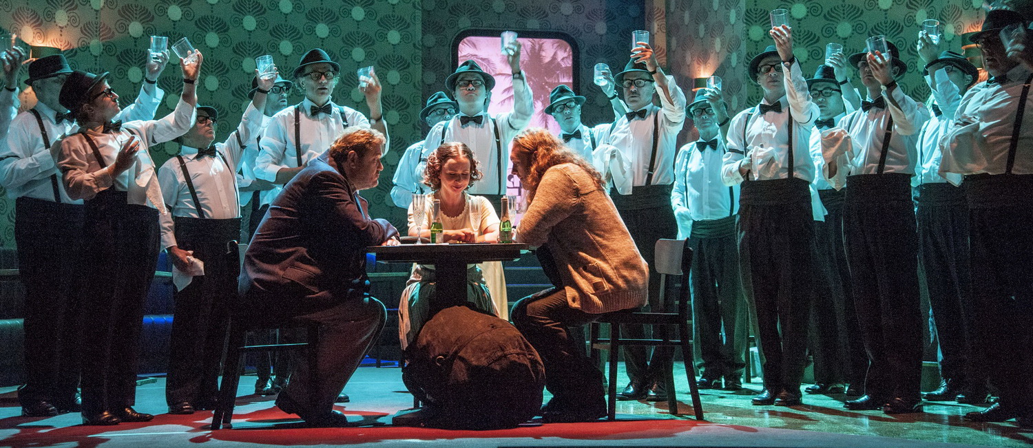 Für die auf der rechten Bühnenseite von einem elegant geschwungenen Bartresen dominierte Kinogastronomie mischt Petra Mollérus Art déco mit zeitgenössischen Lounge-Elementen in unentschiedenen Brauntönen. Im Hintergrund führt eine Treppe in den Kinosaal, über deren Absatz der Holländer auf einem Plakat den aktuell dort gezeigten Film über den Schrecken aller Zonen bewirbt.