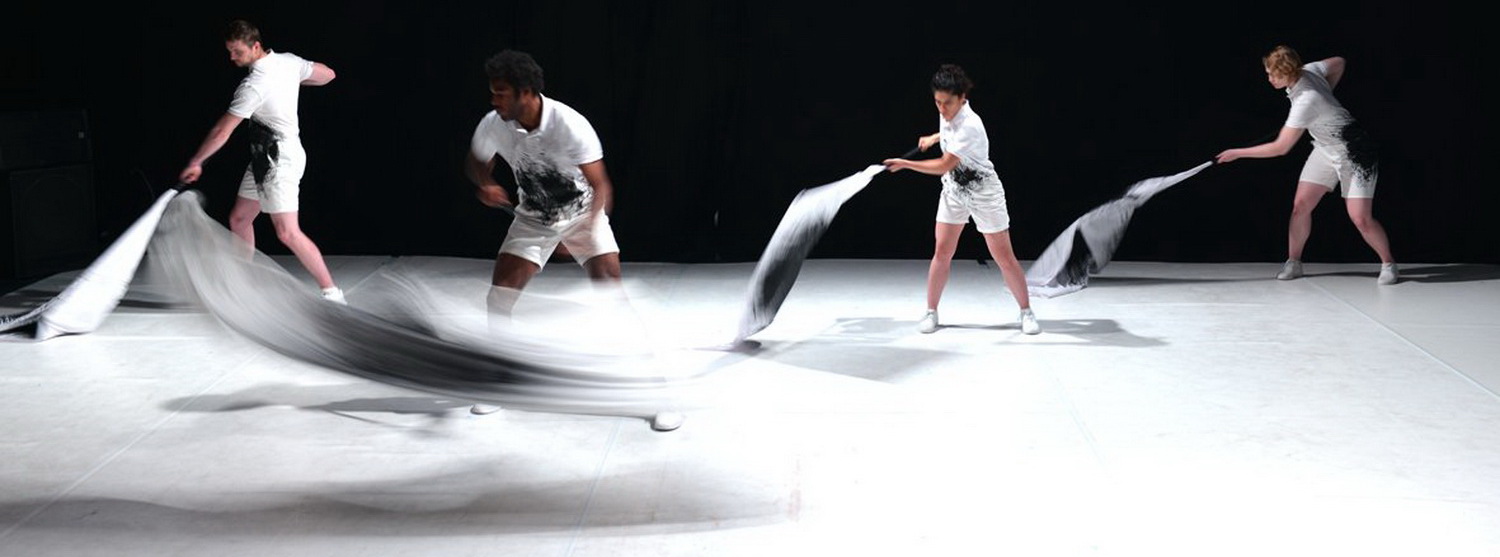 Schwarze Tintenflecke auf weißer Fläche schaffen das Corporate Design, also das einheitliche Erscheinungsbild, der Choreografie. Davon zeugt schon ein Banner, das über dem Eingang zur Probenbühne aufgehängt ist, vor dem die Besucher sich unverständlicherweise und ohne weitere Erläuterungen der Veranstalter eine Viertelstunde lang die Beine in den Bauch stehen müssen. Gleichermaßen sind die Kostüme wie auch die Fahnen von Santiago Alvarez gestaltet. Die Bühne hat Ronni Shendar in schmucklosem Schwarz ausgeschlagen. Von den Traversen strahlt schlichtes, weißes Licht. Ein Raum im Nichts. Die hier gezeigte Zeremonie kann überall und immer stattfinden.