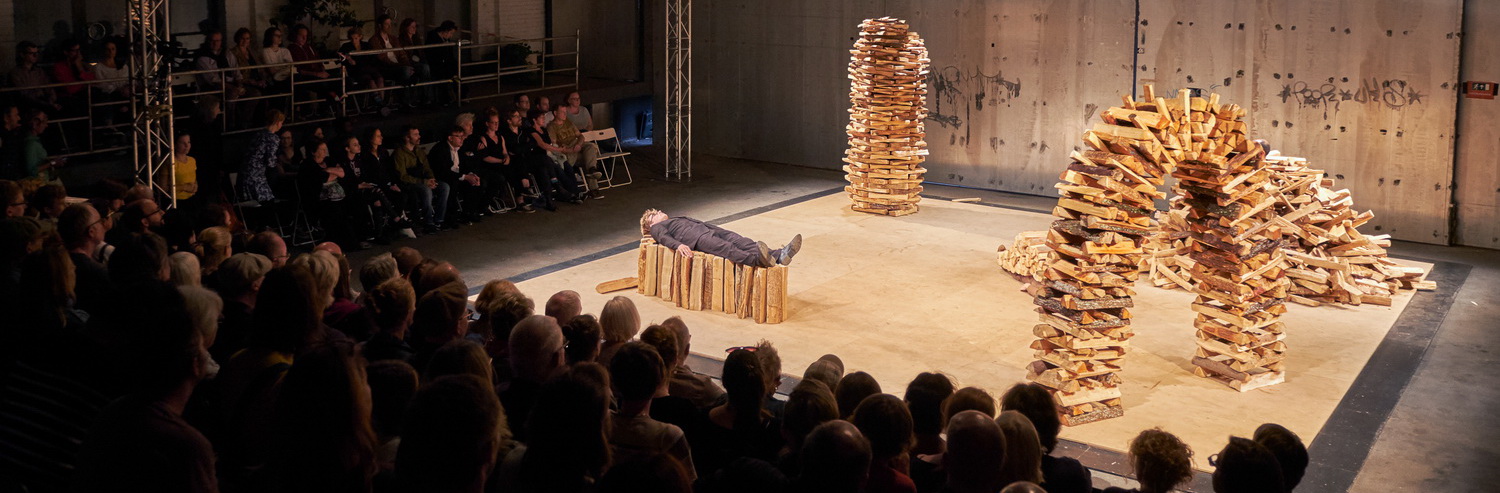 Auf der Bühne vier kunstvoll gestaltete Aufbauten von Holzscheiten im grellweißen Licht, das unverändert bleibt. Erst auf den zweiten Blick sind in den Gebilden Männer zu erkennen. Julian Blight, Mathieu Delangle, Valentin Pythoud und Claudio Stellato beginnen, die Kunstwerke von innen heraus zu dekonstruieren. Die Holzscheite zerfallen zu Haufen, werden immer wieder verschoben, neue Konstruktionen werden begonnen, die nicht zum Ende kommen. Eine schweißtreibende Angelegenheit, von der Angst getrieben, wohin sich die Holzscheite bewegen. Der unvorstellbare Umgang mit Holz wird gezeigt. Jeder, der schon mal mit Holz gearbeitet hat, weiß, welche Gefahren, welches Ungemach damit verbunden sind. Hier sieht das alles nach Selbstverständlichkeiten körperlicher Schwerstarbeit aus.