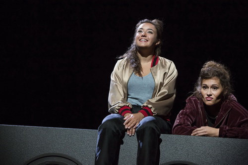 Es gibt in dieser fiktiven Geschichte keine Gewinner. Und zu den Verlierern zählen auch die Leser, die sich durch eine „milieugetreue“ Sprache quälen müssen, die sich zwischen Opfer, Alter, Muschi und Fotze in Belanglosigkeiten erschöpft. Regisseur Jan Gehler hat sich davon nicht abschrecken lassen und das Werk in der Theaterfassung von Robert Koall auf die Kleine Bühne des Central, der Ausweichspielstätte des Düsseldorfer Schauspielhauses am Hauptbahnhof, gebracht. Sabrina Rox hat dazu eine spartanische Bühne entworfen. Eine Doppelreihe von überdimensionalen Lautsprecherboxen, die möglicherweise für trostlose Wohnblocks stehen, muss ausreichen, um sich darauf und davor zu tummeln. Später wird diese Reihe in den Hintergrund unter ein Netz von Leuchtkörpern zurückgefahren. Konstantin Sonneson unterstützt die Dramatik mit zurückhaltenden, aber effektvollen Lichteinsätzen. In dieser Umgebung tummeln sich die vier Schauspielerinnen in „milieutypischen“ Kostümen. Oder solchen, die Claudia Irro dafür hält. Trainingshosen, T‑Shirts und Glitzerjacken, zwischenzeitlich ein paar High heels, schmücken die Damen nicht, unterstreichen aber die ganz eigene Kleiderkultur jener Kreise, die hier dargestellt werden. Komponist Vredeber Albrecht untermalt die Geschehnisse mit einer pulsierenden, nur selten in den Vordergrund tretenden Geräuschkulisse.