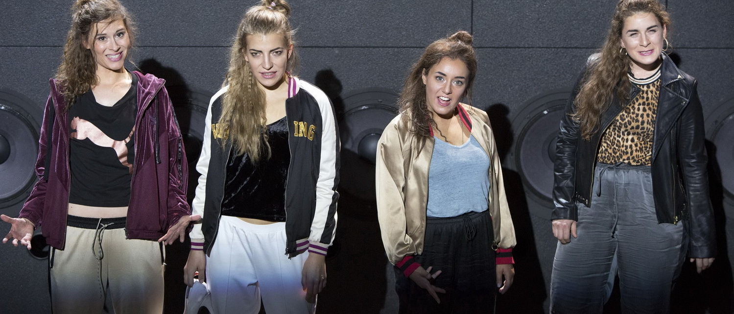 Es gibt in dieser fiktiven Geschichte keine Gewinner. Und zu den Verlierern zählen auch die Leser, die sich durch eine „milieugetreue“ Sprache quälen müssen, die sich zwischen Opfer, Alter, Muschi und Fotze in Belanglosigkeiten erschöpft. Regisseur Jan Gehler hat sich davon nicht abschrecken lassen und das Werk in der Theaterfassung von Robert Koall auf die Kleine Bühne des Central, der Ausweichspielstätte des Düsseldorfer Schauspielhauses am Hauptbahnhof, gebracht. Sabrina Rox hat dazu eine spartanische Bühne entworfen. Eine Doppelreihe von überdimensionalen Lautsprecherboxen, die möglicherweise für trostlose Wohnblocks stehen, muss ausreichen, um sich darauf und davor zu tummeln. Später wird diese Reihe in den Hintergrund unter ein Netz von Leuchtkörpern zurückgefahren. Konstantin Sonneson unterstützt die Dramatik mit zurückhaltenden, aber effektvollen Lichteinsätzen. In dieser Umgebung tummeln sich die vier Schauspielerinnen in „milieutypischen“ Kostümen. Oder solchen, die Claudia Irro dafür hält. Trainingshosen, T‑Shirts und Glitzerjacken, zwischenzeitlich ein paar High heels, schmücken die Damen nicht, unterstreichen aber die ganz eigene Kleiderkultur jener Kreise, die hier dargestellt werden. Komponist Vredeber Albrecht untermalt die Geschehnisse mit einer pulsierenden, nur selten in den Vordergrund tretenden Geräuschkulisse.