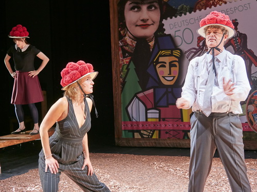 Für das Bühnenbild hatte Kirsten Dephoff eine grandiose Idee. Als das Licht angeht, wird ein schwarzes Tuch vom Spielgrund gezogen. Zum Vorschein kommt eine Boden-Deko, die aus einer Million Cent-Stücken besteht – mit einem Gesamtgewicht von 2,3 Tonnen, wie der Zuschauer später erfährt. Eine Menge Geld, die die beiden Moderatoren der Spielshow rund um das kalte Herz zu verwalten haben. Sie sind zunächst so gekleidet, wie man sich das von Moderatoren einer Fernseh-Show erwartet, später werden sie in futuristischen Turnanzügen auftreten. Die Kandidaten tragen Alltagskleidung, wenn sie nicht zusätzliche Accessoires wie Schwarzwaldhüte oder bunte Jacken, Hasenmasken oder Trachtenstücke überstülpen. Dephoff hat auch hier detailfreudig und durchdacht gearbeitet. Ebenso wie in den meisten Fällen auch Konstantin Sonneson mit dem Licht, wenn er es nicht gerade für eine gute Idee hält, das Publikum zu blenden.