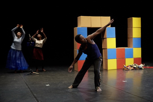Dabei hätte Choreograf Panaibra Gabriel Canda weitaus mehr Aufmerksamkeit für sein Stück verdient, denn es handelt von einem brandaktuellen Thema, das er an historischen Ausgangssituationen festmacht. Auf einer leeren Bühne, links ist der Arbeitsplatz des Musikers aufgebaut, werden Kartons hereingetragen, mit denen der Turm zu Babel aufgebaut wird, während eine portugiesisch sprechende Stimme aus dem Off viel zu laut über den Zusammenhang zwischen Sprache, Gefühl und Gedanken philosophiert. Auf der Rückwand werden deutsche und englische Übertitel in der Übersetzung von Dora Kapusta angezeigt. Das ist auch für Sprachkenner gut, denn Canda spricht ein sehr spezielles Portugiesisch. Hintergrund ist formal der Umstand, dass es in Mosambik seit der Kolonialisierung eine offizielle Amtssprache, eben Portugiesisch, und 64 ursprüngliche Sprachen gibt. „In einem solchen Land“, sagt Canda, „ist der Körper stark, nicht das Wort, dem wir nicht mehr glauben.“