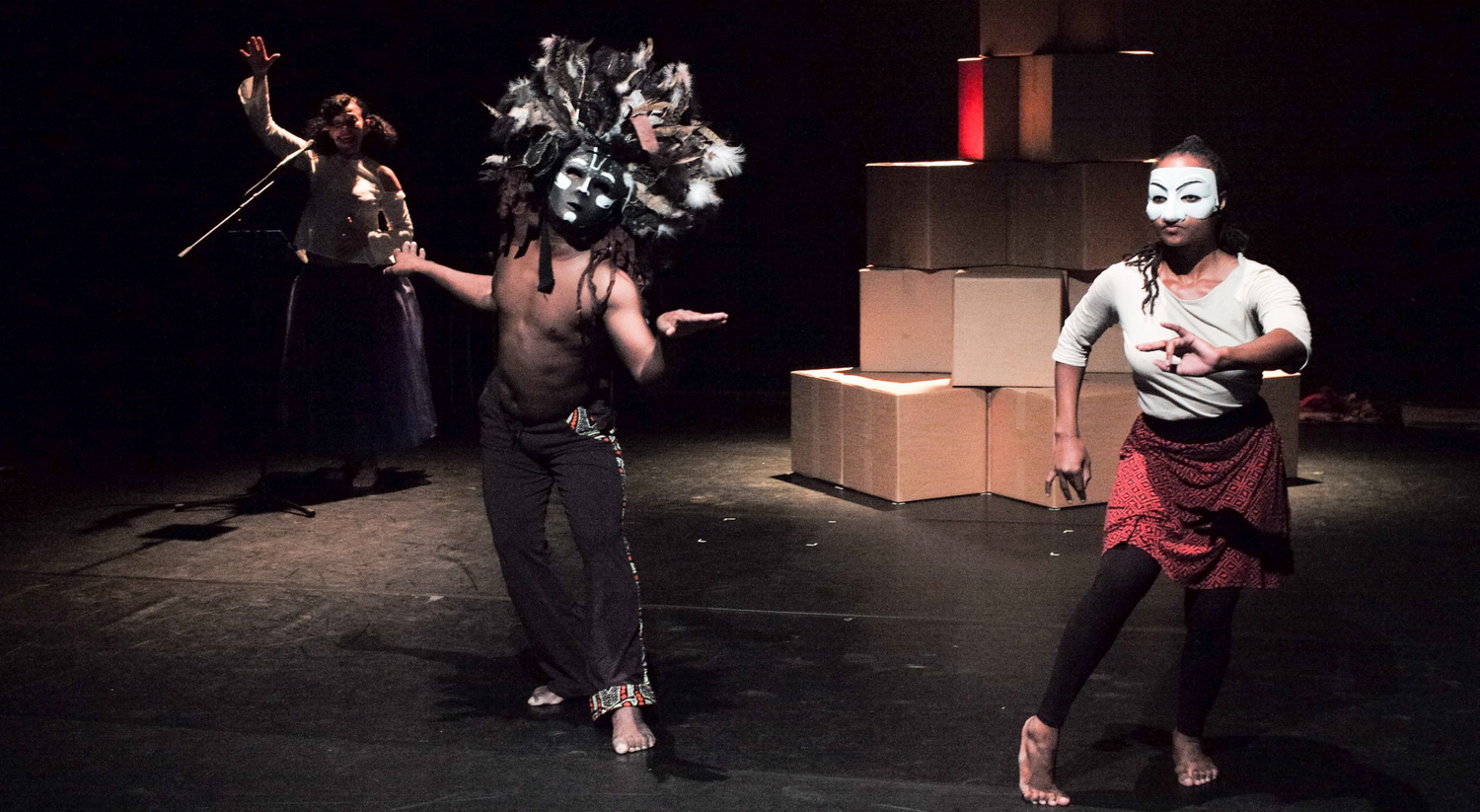 Dabei hätte Choreograf Panaibra Gabriel Canda weitaus mehr Aufmerksamkeit für sein Stück verdient, denn es handelt von einem brandaktuellen Thema, das er an historischen Ausgangssituationen festmacht. Auf einer leeren Bühne, links ist der Arbeitsplatz des Musikers aufgebaut, werden Kartons hereingetragen, mit denen der Turm zu Babel aufgebaut wird, während eine portugiesisch sprechende Stimme aus dem Off viel zu laut über den Zusammenhang zwischen Sprache, Gefühl und Gedanken philosophiert. Auf der Rückwand werden deutsche und englische Übertitel in der Übersetzung von Dora Kapusta angezeigt. Das ist auch für Sprachkenner gut, denn Canda spricht ein sehr spezielles Portugiesisch. Hintergrund ist formal der Umstand, dass es in Mosambik seit der Kolonialisierung eine offizielle Amtssprache, eben Portugiesisch, und 64 ursprüngliche Sprachen gibt. „In einem solchen Land“, sagt Canda, „ist der Körper stark, nicht das Wort, dem wir nicht mehr glauben.“
