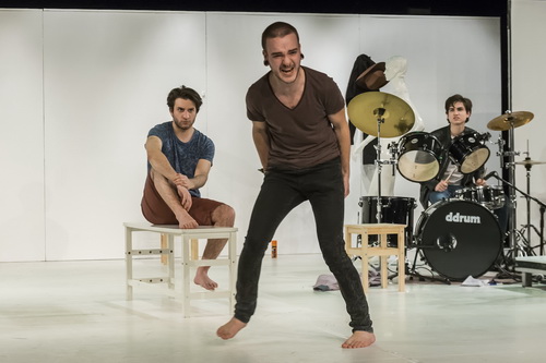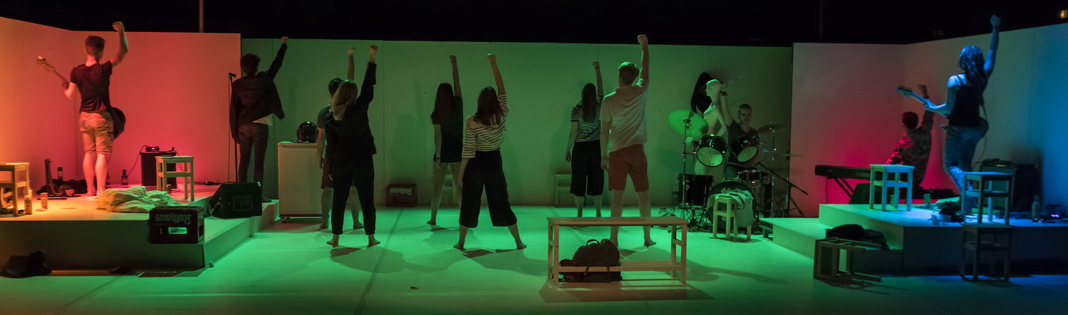 Viele der Requisiten sind bereits bekannt: Einzelne Stühle, Bänke, ein paar Bierkästen, eine Schaufensterpuppe, alles immer schnell beweglich. Links und rechts in der weißen Bühnenlandschaft ein Podest, auf und hinter denen die Musikinstrumente untergebracht sind. Hier können sich die Darsteller nun zu kurzen, teils kommentierten Dialogen treffen, chorartig zusammenrücken oder einfach entrückt tanzen. Es gibt derbe Sprüche, Gags mit und ohne vorhersehbare Pointe, Intrigen um Chinchillas, einen berührenden Moment mit einem Eisbären und deftig rockige Musik. Zwischendurch wird noch ein Theaterstück einstudiert. Kaum ein Darsteller, der mit einer einzigen Rolle auskommt. Also sind permanente „Kostümwechsel“ angesagt. Diesmal haben die Akteure nicht auf Hilfe von außen gesetzt, sondern sich selbst überlegt, wie sie die Figuren charakterisieren können. Ein echter Gewinn! Barfuß tanzen sie durch diesen Sommer, in dem ein Panzer auf die Schule fällt und nicht nur Liebeswunden in die noch so verletzlichen Seelen geschlagen werden, sondern auch der ganz normale Wahnsinn zuschlägt. Hier ein T‑Shirt weniger, da eine Lederjacke obendrauf, Haarspray sorgt für neue Frisuren bei den Jungs, es ist kaum zu glauben, was auf dieser Bühne in 75 Minuten alles vonstattengeht. Das Leben pulsiert, irritiert, euphorisiert, langweilt und irgendwann geht diese Schule einfach wieder los.