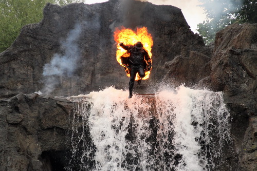 Doch der Zauber geht eben von dieser riesigen breiten Bühne aus, wo man den Kopf wirklich bewegen muss, um sie komplett anzuschauen. Links sind die Block­hütten inklusive Saloon als Revier der „Weißen“, rechts steht das Pueblo der Apachen, angelehnt an den fast mittigen Felsen, auf dem der finale Showdown statt­findet. Eine riesige Explosion, ein schrei­ender Stuntman, eine gewaltige Wasser­kaskade. Dieses Ende löst immer Begeis­terung aus. Dabei sind die Pyroef­fekte von Stephan Kieper bei all ihrer Effek­ti­vität immer das kleine Detail, was Eltern bei dem Besuch mit Kindern unter­schätzen. Denn die Knall­ef­fekte haben es in sich, und so sieht man immer wieder Eltern­teile, die mit zu jungen Kindern die Vorstel­lungen zu früh abbrechen müssen.