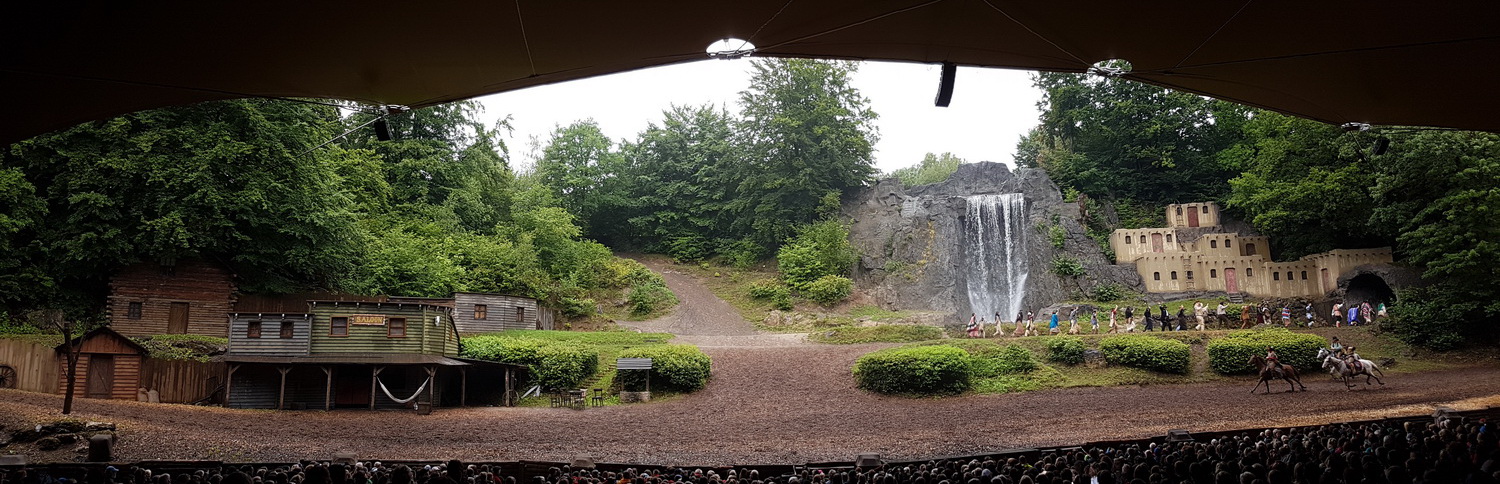 Doch der Zauber geht eben von dieser riesigen breiten Bühne aus, wo man den Kopf wirklich bewegen muss, um sie komplett anzuschauen. Links sind die Block­hütten inklusive Saloon als Revier der „Weißen“, rechts steht das Pueblo der Apachen, angelehnt an den fast mittigen Felsen, auf dem der finale Showdown statt­findet. Eine riesige Explosion, ein schrei­ender Stuntman, eine gewaltige Wasser­kaskade. Dieses Ende löst immer Begeis­terung aus. Dabei sind die Pyroef­fekte von Stephan Kieper bei all ihrer Effek­ti­vität immer das kleine Detail, was Eltern bei dem Besuch mit Kindern unter­schätzen. Denn die Knall­ef­fekte haben es in sich, und so sieht man immer wieder Eltern­teile, die mit zu jungen Kindern die Vorstel­lungen zu früh abbrechen müssen.