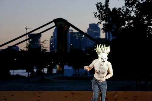 Die letzte Premiere der ganz wesentlich durch die Regie­ar­beiten Michael Thalheimers geprägten Intendanz von Oliver Reese findet unter freiem Himmel statt. Zwar ist die Produktion als erstes der bedeu­tenden Antiken­pro­jekte am Frank­furter Schau­spiel bereits zu Reeses Einstand im Jahr 2009 heraus­ge­kommen, nun unter freien Himmel verlegt , wird dennoch eine regel­rechte Premiere daraus. Die Bühne ist auf der einstigen Weseler Werft am Mainufer aufge­schlagen. Schräg hinter der Zuschau­er­tribüne befindet sich die Europäische Zentralbank, davor in einiger Entfernung, aber noch eindrucksvoll genug ragen die Bürotürme der Frank­furter Innenstadt.