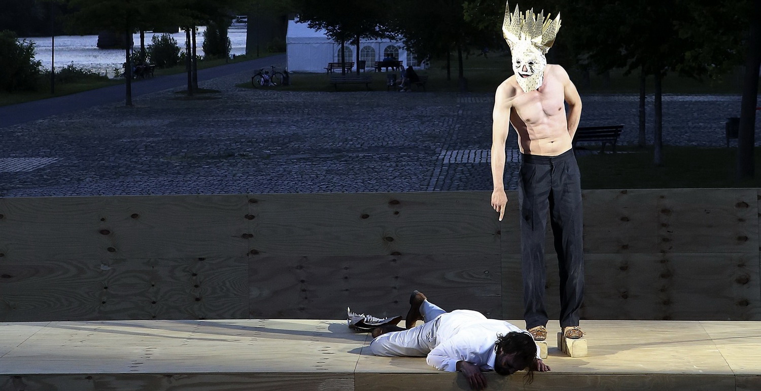 Die letzte Premiere der ganz wesentlich durch die Regie­ar­beiten Michael Thalheimers geprägten Intendanz von Oliver Reese findet unter freiem Himmel statt. Zwar ist die Produktion als erstes der bedeu­tenden Antiken­pro­jekte am Frank­furter Schau­spiel bereits zu Reeses Einstand im Jahr 2009 heraus­ge­kommen, nun unter freien Himmel verlegt , wird dennoch eine regel­rechte Premiere daraus. Die Bühne ist auf der einstigen Weseler Werft am Mainufer aufge­schlagen. Schräg hinter der Zuschau­er­tribüne befindet sich die Europäische Zentralbank, davor in einiger Entfernung, aber noch eindrucksvoll genug ragen die Bürotürme der Frank­furter Innenstadt.