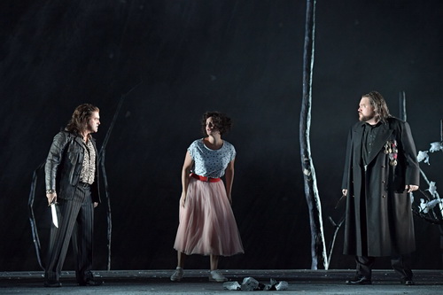 David Bösch stellt Bilder und arrangiert Tableaus. Die Figurenkonstellation bleibt im Dekorativen stecken. Der Abend läuft auf das entschiedene Bekenntnis zu hübschen Grüppchen hinaus. Bekenntnis wohlgemerkt, denn oft fehlt dem Arrangeur schlicht die Optik, um das gewünschte Ergebnis zu erzielen. Bösch, der vom Schauspiel kommt, scheint für verlorene Liebesmüh‘ zu halten, im Musiktheater Motive und Tiefenschichten auszuloten. Die Akteure bleiben daher weitgehend sich selbst und ihren jeweils mehr oder minder vorhandenen darstellerischen Gaben überlassen. Inzwischen wird derart vorsintflutliche Spielleitung meist selbst an mittleren Bühnen im romanischen Sprachraum kaum mehr geduldet. Wenngleich sie dort in der Regel immerhin handwerklich in Ordnung geht.