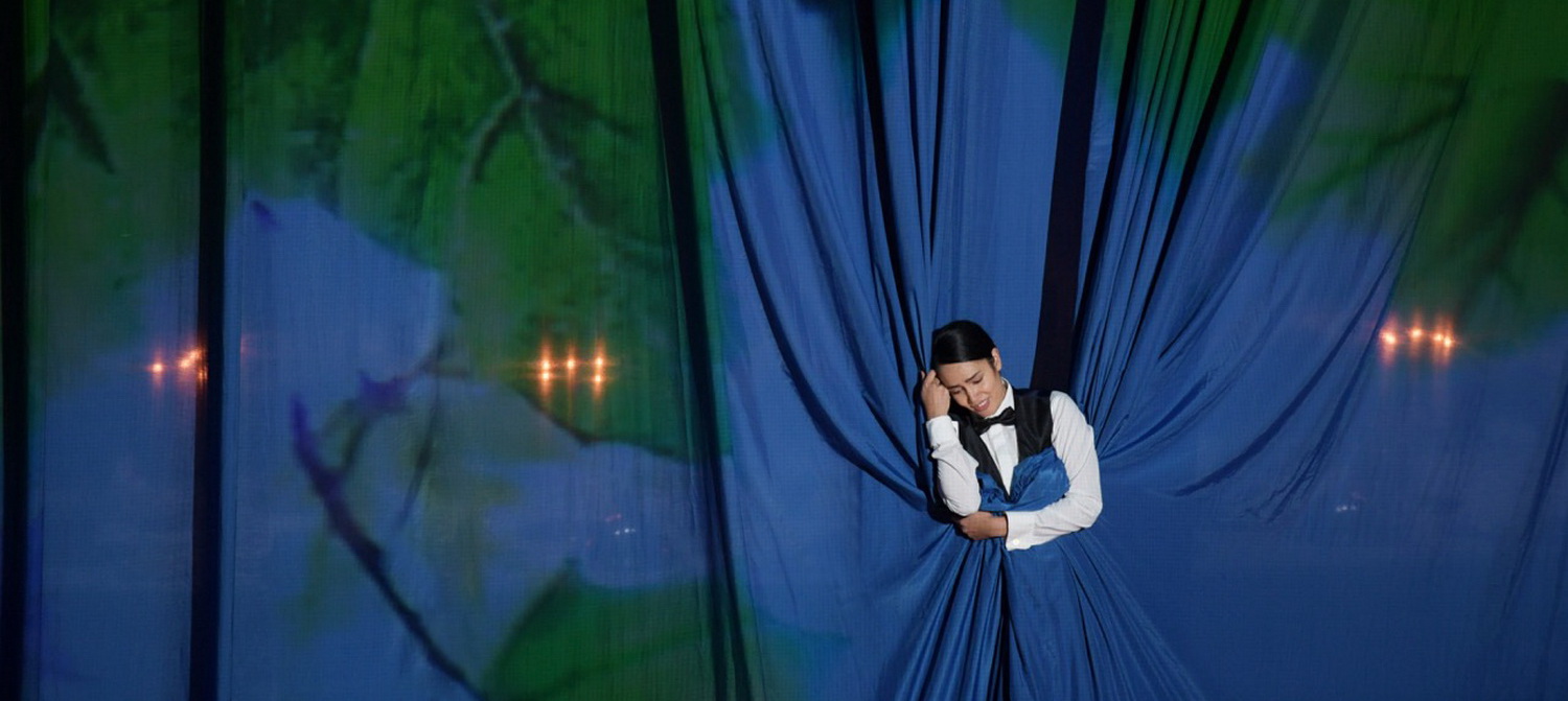 Dann tritt Xerxes vor den Vorhang und mit ihm verwandelt sich das Bild. Eine übergroße Platane in sattem Grün auf den Vorhang projiziert kündigt eindeutig an, was kommt. Ombra mai fu, so bekannt wie missverstanden, an dieser Stelle für manchen Zuhörer ungewohnt zart, inniglich, inwendig. Während Xerxes singt, wickelt er sich immer mehr in den Vorhang, bis er völlig verschwindet, als wolle er nur eins werden mit der Natur, dem Idealzustand eines glücklichen Lebens, das er an diesem Abend in keinem Moment mehr empfinden wird.