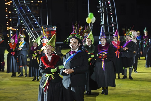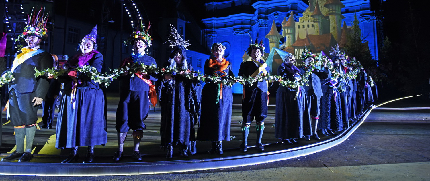 Was Opern­lieb­haber und Festi­valfans bei Aldens Sicht der Dinge zugemutet wird, sprengt jede Vorstel­lungs­kraft. Die Bühne ist so breit wie die Zuschau­er­tribüne. Auf beiden Seiten stehen ein paar traurige Tannen und die veran­schau­lichen plakativ: Achtung, Deutschland! Auf diesem Feld und auf der Geisterbahn, die unmoti­viert durchs Bild rollt, tummeln sich allerlei garstige Gestalten. Schwarz gekleidete Männer mit Melonen verkörpern böse Anwälte, die der gedemü­tigten Loreley einen Henkers-Vertrag unter­jubeln wollen, ein unheim­licher Wirt, vermutlich aus dem Spessart, hat Hörner auf dem Kopf, das maskierte Volk, darunter auch biedere Beamte, trippelt in grotesken Trach­ten­kleidern durch die Szenerie und der Rhein­fürst ist ein hyper­ak­tiver Spastiker, der mit seinem Modell-Segel­schiff spielt. Loreley wird anfangs gleich mehrfach gespiegelt: Man sieht sie als psychisch labile Frauen mit Borderline-Syndrom.