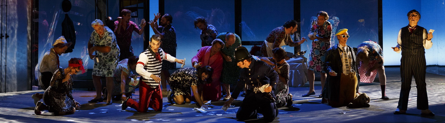 Brown kombi­niert hier vieles, was als lustig gilt. Angefangen vom Auftritt des Figaro auf den Rängen über das Zeitlu­pen­tempo bis zum Toupet von Bartolo kommt eigentlich alles vor. Zugegeben, der Einfall mit den Stoff­hunden, die ebenfalls Blinden­brillen tragen, ist genauso ein Schmunzeln wert wie die Idee, Don Alonso als kleineres Abbild von Basilio zu doppeln. Ansonsten bleiben es überwiegend jede Menge Mätzchen, die in der Summe keine rechte Komik ergeben. Auch das Hin- und Herschieben der Wände wirkt in zweieinhalb Stunden bisweilen etwas unmoti­viert. Seine Darsteller lässt er in den Rezita­tiven verhungern, so dass sie schließlich an der Rampe landen. Brown kann sich das leisten. Denn wer bei Rossini über gute Stimmen und ein schönes Orchester verfügt, braucht sich kaum mehr über die konzer­tante Aufführung hinaus­zu­wagen. Und der Regisseur hat darüber hinaus spiel­freudige Darsteller, die sich in aller Einfalls­lo­sigkeit noch profi­lieren können.