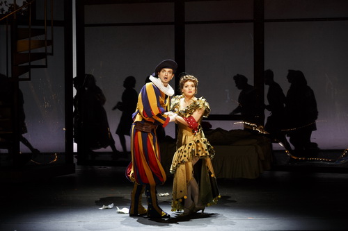 Allen voran einen spitz­bü­bi­schen, harle­kin­ähn­lichen Figaro namens Bruno Taddia, der auch baritonal schön glänzt. Und wenn in tausend anderen Vorstel­lungen der Bartolo gar nicht dümmlich, trottelig oder schluffig genug darge­stellt werden kann, nimmt Bruno de Simone die Rolle in geradezu wunder­barer Weise ernst. Immerhin haben wir es hier nicht mit einem Hofnarren zu tun, sondern mit einem verdienten Arzt, der sein Mündel so wohlge­raten großge­zogen hat, dass ein Adeliger an einer Hochzeit mit ihr inter­es­siert ist. Und so spielt de Simone es hier auch, vergisst dabei den Witz nicht und zeigt, wenn er ins Falsett aufsteigt, zudem seine stimm­liche Bandbreite und sein Können. Ein schönes Paar sind Bogdan Mihai, der den Tenor des Grafen Almaviva wunderbar inter­pre­tiert, und Lena Belkina als Rosina. Bei ihr geht viel Wirkung dank der unglück­lichen Kostüme verloren und sie muss viel Stimme und Darstel­lungs­freude zeigen, um das auszu­gleichen. Mary Feminear schließlich muss ziemlich viel verloren herum­stehen, bis sie endlich ihre Arie zur Freude des Publikums vortragen darf.