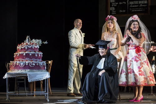 Das kommt der Idee von Regisseur David Bösch entgegen, die Oper so natürlich wie möglich erscheinen zu lassen. Zumindest im ersten Akt soll nicht der artifi­zielle Gesang im Vorder­grund stehen, sondern die Handlung. Dazu hat Falko Herold eine Drehbühne gebaut, die auf der einen Seite eine typisch italie­nische Bar zeigt, auf der Rückseite über ein geräu­miges Schlaf­zimmer verfügt. Don Alfonso ist zum Gastwirt mutiert, was nicht nur Spaß macht, sondern auch genauso gut funktio­niert wie Despina als Kellnerin. Neben diesen stili­sie­renden Kostümen verwendet Bettina Walter viel Fantasie auf die Farbge­staltung insbe­sondere der Kleider der beiden Schwestern. Da darf es richtig bunt werden. Mit wenigen Acces­soires verdeut­licht sie den mehrfachen Rollen­tausch. Den zu erklären, gehört mit zu den schwie­rigsten Aufgaben, die ein Regisseur zu lösen hat, wenn das Publikum nicht durch Rätsel­raten vom Spaß abgehalten werden soll. Bösch schafft größt­mög­liche Klarheit und lässt dabei den Spaß nicht zu kurz kommen. Im zweiten Akt geht ihm dabei ein wenig die Puste aus, und es wird viel „an der Rampe” gesungen. Immerhin fällt ihm aber noch ein, Dorabella und Guglielmo nach der Tenor-Arie Ah, lo veggio, quell’anima bella noch ein bisschen schwofen zu lassen – zu den Cembalo-Klängen von Elvis Presleys Love me tender. Mit Beginn der Hochzeits­feier hat der Regisseur die Situation dann auch wieder im Griff und bringt das Stück schwungvoll zu Ende. Zur Feier selbst fällt dann auch Licht-Designer Michael Bauer noch ein besonders hübscher Effekt ein, ehe der große Coup zum Schlussbild kommt. Ansonsten begnügt er sich mit angenehm situa­ti­ons­ge­rechter Ausleuchtung und rückt die Sänger hier und da mit gekonntem Verfolger-Einsatz ins rechte Licht.