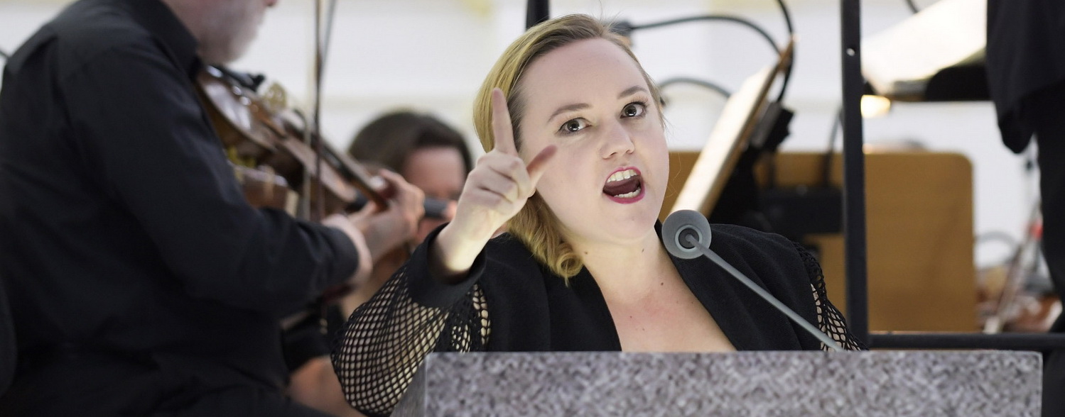 Unter die langsam einströ­menden Besucher mischen sich dunkel gekleidete Personen, die eine Urne vor sich hertragen – mit ernstem Gesicht, gemes­senen Schrittes, in langsamen Bewegungen. Ein gleißend-weißes Licht verbreitet eine kalte Atmosphäre. Kurz vor Beginn der Aufführung nimmt die Zahl der Urnen­träger zu, durch beide Seiten­ein­gänge schreiten sie herein, es werden immer mehr, fast wie eine Versammlung. So viele Urnen, so viele Tote – eine Katastrophe, eine Seuche? Die Versammlung der Urnen­träger nimmt schweigend in einer großen Gedenk­halle Platz, in deren Mitte ein überdi­men­sio­nales Podest steht, der Platz für das Orchester. Regie­an­weisung an die Besucher: „Erheben Sie sich.“ Weitere Textein­schübe folgen, es bleibt unklar, ob es Textpas­sagen aus dem Libretto oder Regie­an­wei­sungen sind.