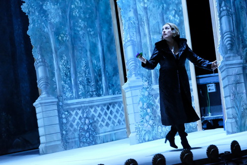 Katharina Thoma kontrastiert die Spielweise der französischen Hohen Tragödie des 18. Jahrhunderts mit ganz und gar heutigen Situationen hinter und jenseits der Bühne. Dass die historisch informierte Aufführungspraxis auf der Szene restlos museal wirkt, nimmt Thoma billigend in Kauf, um dem aus dem Missverhältnis sich stracks einfindenden Affen Ironie reichlich Zucker zu geben. Adriana selbst wird von humoristischen Anwandlungen verschont. Thoma inszeniert indessen weniger die Liebestragödie der großen Schauspielerin als die Künstlertragödie einer überdies Liebenden. Folgt man der Regisseurin auf dieser Spur, so empfindet die Lecouvreur final, wie sehr sie sich in Kunst und Liebe verausgabt hat. Die Rückkehr auf die Bühne erscheint ihr illusionär. Sie wird daher nicht – wie das Libretto vorgibt – von der Nebenbuhlerin um die Liebe des sächsischen Grafen umgebracht, sie tötet sich eigenhändig. Thomas Sichtweise widerspricht Cilèas ganz offensichtlicher Absicht, ein italienisches Gegenstück zu Isoldes Liebestod zu schreiben. Freilich ignoriert Thoma das Streben des Komponisten auf genial unverfrorene Weise. Denn sie schafft die Voraussetzung, um den Schlussakt davor zu bewahren, in bloßes Sentiment zu versinken. Thoma verweigert dem sächsischen Grafen, in Fleisch und Blut zu der seelisch Moribunden zurückzukehren, um sich über den Standesunterschied hinweg zu ihr zu bekennen. Moritz erscheint als Fiebervision der todwunden Seele. Das ist weitaus glaubhafter als jede Realpräsenz, denn bei Licht betrachtet ist der Graf ein Windhund. Auch entlarvt Thoma die vermeintlichen militärischen Erfolge des Offiziers auf dem Bühnenball im dritten Akt als Aufschneidereien, wie sie sonst der Capitano aus der Commedia dell’arte von sich gibt. Passend feuert der Prahlhans dazu aus einer kleinkalibrigen Kanone einen Salut aus goldfarbenem Konfetti ab.