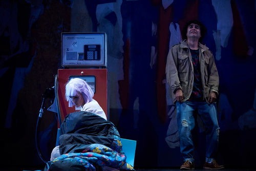 Für seinen Kulissenbaumarkt stoppelt Fabian Lüdicke allerlei Versatzstücke zusammen, aus denen das Weichbild einer beliebigen Großstadt ersteht, deren scheußlich gepinselte Wolkenkratzer in der Ferne aufleuchten. Ganz an dieser Peripherie urbanen Lebens kampieren die Bohemiens im klapprigen, grünen Kleinwagen oder – wie Rodolfo – im Einpersonenzelt. Das nicht eben breite Koblenzer Bühnenportal noch mit einer parallel zur Rampe gestellten Wand einzuengen, muss einem erst einmal einfallen. Jedenfalls ist die Welt bunt und blinkt in billigem Flitterkram. Die Bohemiens legen im letzten Bild einen Tankstop ein. Mimi haucht ihr Leben an einer Zapfsäule aus.
