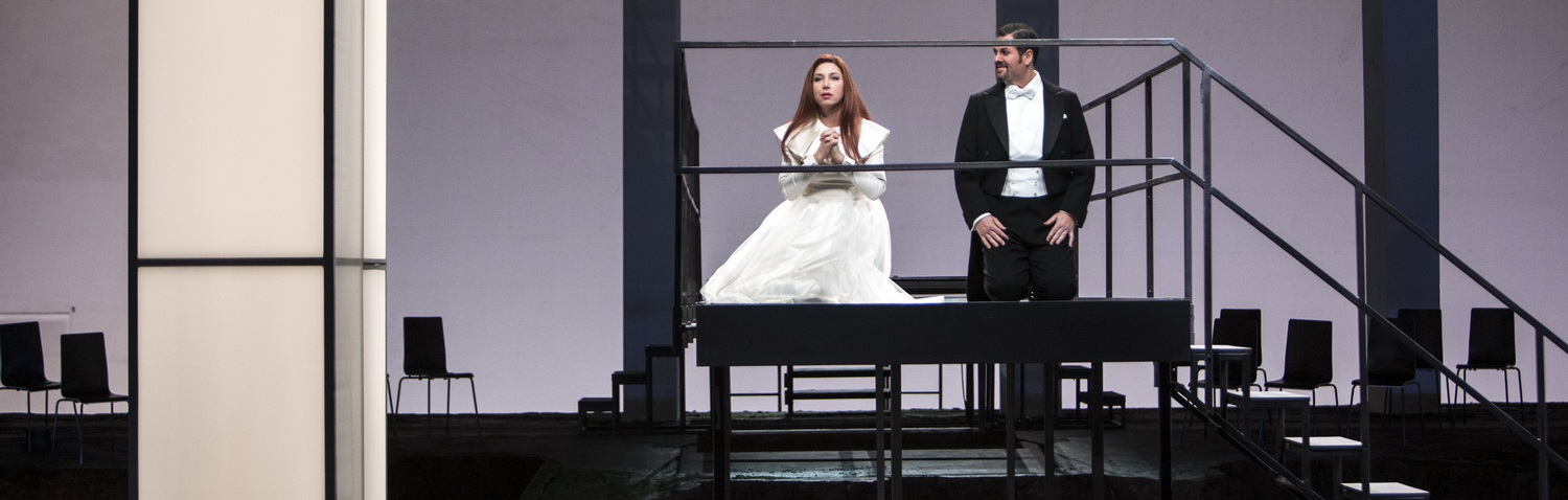 Damit setzt Kinmonth allerdings einen Kontrapunkt zum Bühnenbild von Darko Petrovic und den Kostümen von Annina von Pfuel, die beide auf scharfe Schwarz-Weiß-Kontraste setzen. Religiöser Zierrat ist ausgemerzt. Die breite Bühne des Staatenhauses ist nach hinten dreifach gestaffelt, wobei das Orchester in einem Graben zwischen zwei Spielebenen postiert ist. Ebenen, die die beiden Welten trennen, aber durch eine Brücke und etliche Zugänge durchlässig bleiben. Es zeigt sich eine kühle Welt wie in einem modernen Großraumbüro, und so kühl ist auch die Personenregie geprägt. Die Figuren bewegen sich oft in prozessionshafter Statik, gipfelnd in einem Trauerzug mit der entseelten Elisabeth, bei dem sich Assoziationen an eine roboterhafte Geisterwelt einschleichen, die Kinmonth eigentlich vermeiden wollte. Dass sich mechanische Gesten wiederholen, die an Robert Wilsons mittlerweile abgespulte Erfolgs-Masche erinnern, wirkt ebenfalls eher hilflos und letztlich antiquiert. Man merkt der Produktion an, dass Kinmonth von Hause aus Bühnenbildner ist. Da liegen ihm bildhafte Tableaus‘ näher als eine organische Personenführung. Eine runde Tannhäuser-Inszenierung ist das nicht.