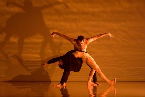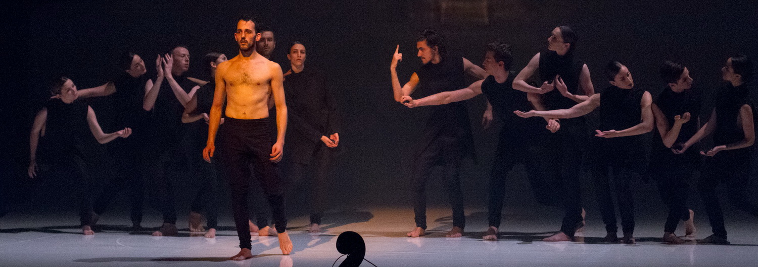 Schon mit der Einrichtung des Bühnenraums ist Adam Keller ein eindrucksvolles Werk gelungen. Immerhin ist hier einiges an Personal auf einer vergleichsweise kleinen Bühne unterzubringen. Der schwarzgekleidete Chor steht links und rechts auf den Bühnenaufgängen und sitzt am Grabenrand. Bei den eigenen Passagen ist er dem Publikum zugewandt, während der Tanzszenen aber wird er selbst zum Publikum, wendet sich der Bühne zu und erhöht so die Konzentration. Die Bühne selbst ist leer, vor dem schwarzen Hintergrund ist eine weiße Projektionsfläche mit schiefer Oberkante angebracht, die nach Bedarf nach oben und unten verschoben wird. Dort werden aber nicht irgendwelche Videos gezeigt, sondern die Bewegungen der Tänzer als Schatten wiedergegeben. Das erhöht die Dramatik ungemein. Ebenso wie das sensationelle Licht, mit dem Yaron Abulafia eine eigene Geschichte erzählt, einen Spannungsbogen aufbaut und Bilder von stiller Intensität schafft. Großartig, wie er mit den wenigen Mitteln, die die Bühnentechnik des Hauses zur Verfügung stellen kann, Effekte schafft, ohne Effekthascherei zu betreiben. Ebenso elegant wie raffiniert präsentieren sich auch die Kostüme von Limor Hershko-Dror. Zu schwarzen Hosen tragen die Tänzerinnen und Tänzer schwarze Überwürfe, die eine stilvolle, dem Thema angemessene Würde ausstrahlen. An der Seite sind sie weit geschlitzt und geben den Blick auf die gestählten Oberkörper in hautfarbenen Trikots frei.