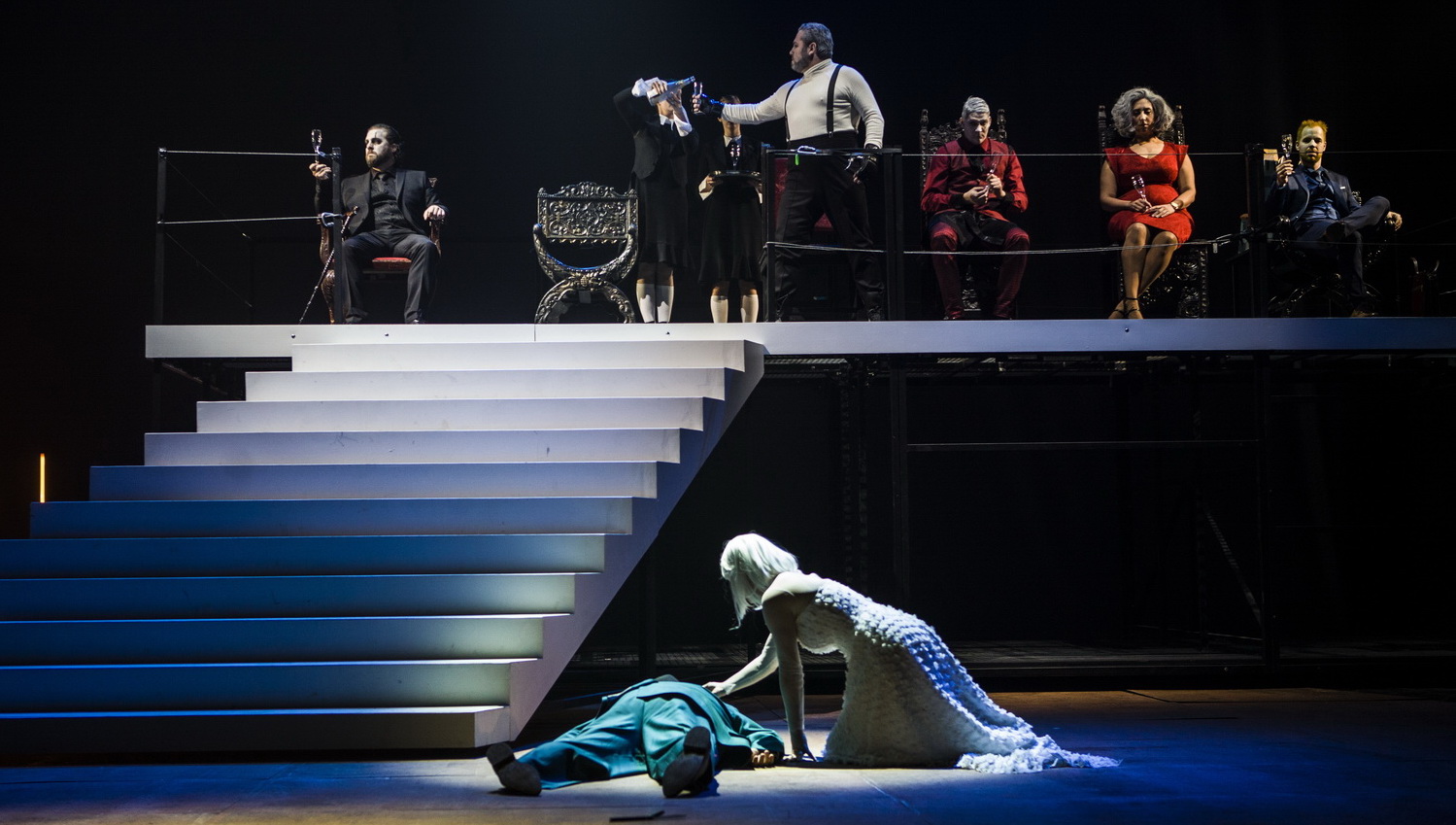 Trotz der Sektgläser in der Hand will keine Feierstimmung aufkommen. Kraft- und saftlos sitzen die Götter zusammengesunken in ihren Stühlen auf einem Podium vor einem Modell von Wallhall mit leuchtenden Speeren im Hintergrund, während Freia unten neben dem toten Fasolt kniet. Sie scheinen alle völlig resigniert zu haben. Dabei sollten sie sich auf ihre neu erbaute, prächtige Burg Walhall freuen. Erst ganz spät, wenn bereits im Orchester in voller Pracht der Einzug der Götter erklingt, raffen sie sich auf und beginnen, langsam die Treppe hinab zu steigen: Ein ziemlich düsteres Bild zeichnet Igor Pison aber nicht nur im Finale von Richard Wagners Das Rheingold. Der Regisseur scheint mit seinen dunklen Lichtstimmungen bereits die heraufdräuende Götterdämmerung vorwegnehmen zu wollen.