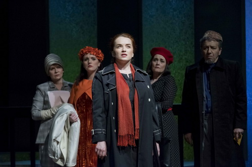 Menotti verar­beitet eigene Erleb­nisse mit Flücht­lingen, die in den 1950-er Jahren in den USA Zuflucht suchen wollten und dort auf ähnlich bürokra­tische Hemmnisse gestoßen sind. Und gerade wegen der weich gespülten Musik wäre es wichtig, szenisch harte Akzente und Kontra­punkte zu setzen. Doch das wagt die junge Regis­seurin Katja Bening in ihrer ersten großen Eigen­pro­duktion nicht. Bisher trat sie als Regie­as­sis­tentin und Abend­spiel­lei­terin Theater Krefeld Mönchen­gladbach in Erscheinung und erzielte mit der Einstu­dierung von Tom Johnsons Vier-Ton-Oper im Studio Beachtung. Mit dem Konsul geht sie leider ebenso zaghaft um wie der Musiker Menotti. Keine Frage: Sie führt die Figuren präzise und vor allem die Gewis­sens­qualen Magdas vermag sie mit großem Feingefühl und handwerk­lichem Können eindrucksvoll zu formen. Doch weder die Bedrohung durch das Terror-Regime noch die mensch­liche Kälte des „demokra­ti­schen“ Staats finden eine geeignete Umsetzung. Die Zimmer­tem­pe­ratur wird nicht unter­schritten, die geister­haften Erschei­nungen der Verstor­benen versöhnen eher mit dem Elend, als aufrüt­telnd zu wirken.
