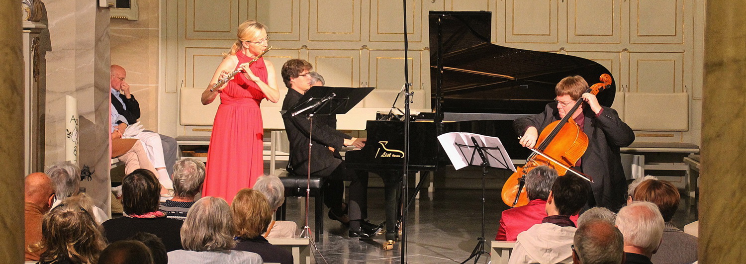 Triowelten nennt sich das jüngste Programm. Die zahlreichen Zuhörer erwartet freilich kein klassi­sches Klavier- oder Streichtrio, sondern die seltenere Besetzung für Flöte, Klavier und Violon­cello. Drei namhafte und dem Festival eng verbundene Künstler sorgen für überwiegend flotte, alles andere als sakrale Töne. Zusammen mit der künst­le­ri­schen Leiterin Anette Maiburg an der Flöte sind mit dem jungen, bereits mit Preisen hoch dekorierten Pianisten Florian Noack und dem namhaften Cellisten Guido Schiefen zwei regel­rechte Publi­kums­lieb­linge am Werk.