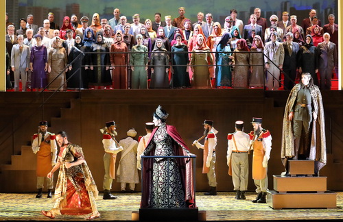 Gelungen und sehr realistisch versetzt Paul Steinberg in seinem Bühnenentwurf die Handlung in das moderne Arabien der überdimensionalen Prachtbauten und der überlebensgroßen Darstellung der Herrscher in Bild und Skulptur. Der großangelegte erste Akt führt gleich an den Hof der Königin Semiramide, die nach dem Mord an ihrem Gatten, dem gottgleich verehrten Diktator Nino, erfolgreich regiert. Einem Staatsbesuch gleich marschiert der Chor in stilechten, modernen Kleidergewohnheiten des Vorderen Orients ein – sehr gut beobachtet von Kostümbildnerin Buki Shiff. Große Wandporträts der Familie und des verstorbenen Herrschers schauen Ehrfurcht einflößend auf das gemeine Volk. Geschickt wird die aufwändige Bühne durch Verschieben der Wände verkleinert. Wenige Requisiten werden benutzt, meist bleibt die Bühne leer, und Licht und Videoeffekte mischen das monumentale Bild auf.