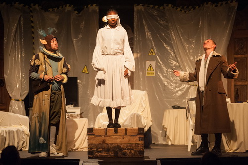 Dabei gibt sich Regisseur Stephen Jameson redlich Mühe, Saft und Kraft des Stückes über die vier Jahrhun­derte ins Heute zu retten. Mit nahezu allen Mitteln, vor allem aber Lautstärke. Kein probates Mittel. Colin Mayes hat sich der Bühne und der Kostüme auf exzel­lente Weise angenommen. Im eigent­lichen Bühnenraum ist eine Wohnland­schaft aufgebaut, in der eine Sessel­gruppe mit Fernseher und ein Esszimmer Platz finden. Sämtliche Gegen­stände sind mit Tüchern abgedeckt, schließlich hat der Eigen­tümer sich kurzerhand aus dem pestge­plagten London verzogen. Im Hinter­grund sind drei histo­rische Türen aufge­stellt. Die Zwischen­räume sind mit Plastik­planen verklebt. Im Vorder­grund ist eine Schatz­kiste aufgebaut. Auf der ersten Ebene befindet sich der Eingangs­be­reich des Wohnhauses, der mittels einer Rufanlage überwacht werden kann. Zu den besseren Szenen gehört eindeutig, wenn die Bühne von ihrer Verkleidung befreit wird. Der Eigen­tümer mutiert bei seiner Rückkehr zur Eigen­tü­merin. Die Spielerei mit den Geschlechtern überzeugt nicht so richtig, tut aber auch keinem weh. Die Kostüme changieren zwischen fanta­sievoll, lustig und, was Doll angeht, gar ins Erotische. Ins rechte, wenn auch unauf­ge­regte Licht werden die Mitwir­kenden von Adam King gestellt. Sein plötz­licher Licht­wechsel beim Öffnen der „Schatz­kiste“ nutzt sich über die zwei Stunden dann doch ein wenig ab, zumal die Schluss­pointe ausbleibt.