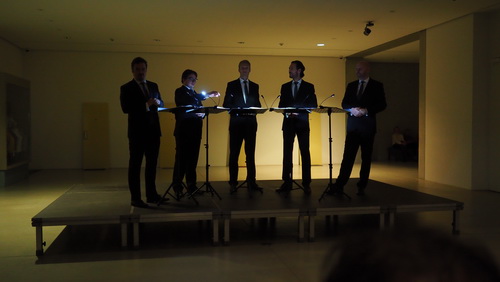 Inmitten dieses Bunkers tritt im Rahmen des Nieder­rhein-Musik­fes­tivals der A‑Cap­pella-Chor Ensemble Amarcord auf. Amarcord heißt im Italie­ni­schen „Ich erinnere mich“ und steht für das Resümee persön­licher Erfah­rungen auf der Bühne. Seit einem Viertel­jahr­hundert begeistern die fünf Sänger das Publikum mit ihrem Können und ihren Erfah­rungen. Jetzt steht eine Reise durch Amerika auf dem Programm. Die Besucher bekommen lediglich einen Zettel in die Hand, auf dem für den ersten Teil des Abends weitgehend unbekannte Werke stehen und der für die Zeit nach der Pause „Songs nach Ansage“ verspricht.