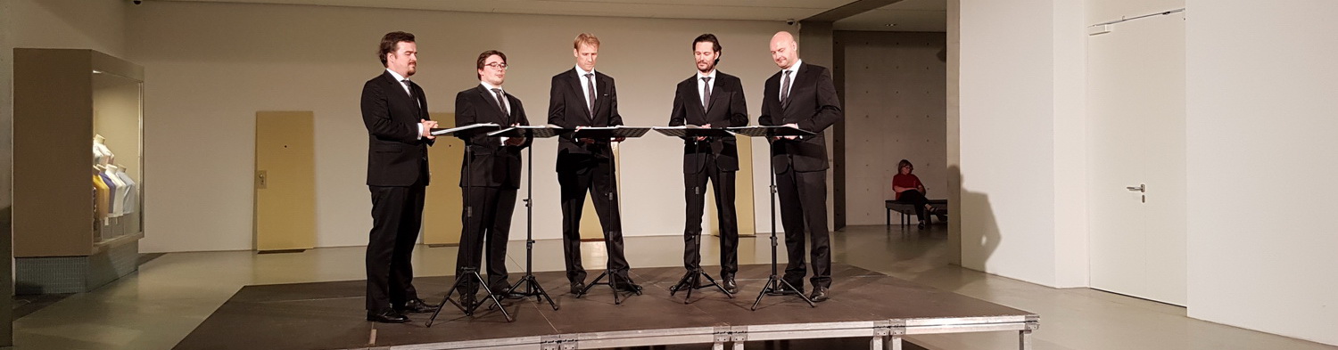 Inmitten dieses Bunkers tritt im Rahmen des Nieder­rhein-Musik­fes­tivals der A‑Cap­pella-Chor Ensemble Amarcord auf. Amarcord heißt im Italie­ni­schen „Ich erinnere mich“ und steht für das Resümee persön­licher Erfah­rungen auf der Bühne. Seit einem Viertel­jahr­hundert begeistern die fünf Sänger das Publikum mit ihrem Können und ihren Erfah­rungen. Jetzt steht eine Reise durch Amerika auf dem Programm. Die Besucher bekommen lediglich einen Zettel in die Hand, auf dem für den ersten Teil des Abends weitgehend unbekannte Werke stehen und der für die Zeit nach der Pause „Songs nach Ansage“ verspricht.