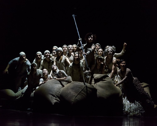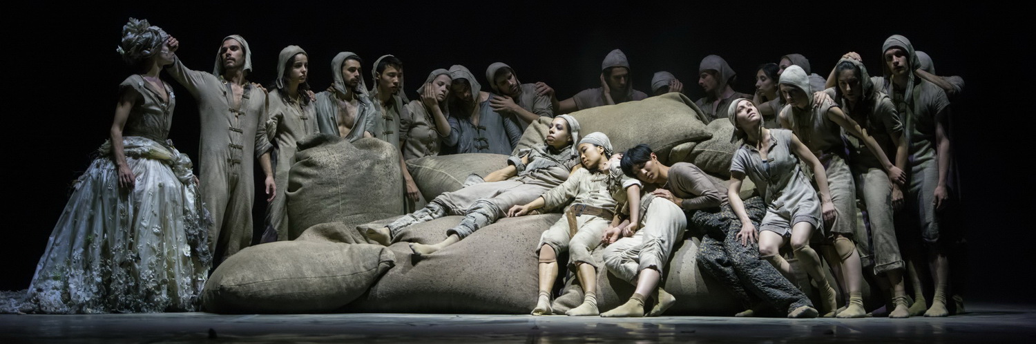 Bei Montero beginnt das getanzte Geschehen seines Don Quijote in einem kahlen, geschlos­senen Raum mit einer Wand im Hinter­grund; diese Bühne von Eva Adler und Montero verengt sich später oder weitet sich scheinbar durch einen Vorhang, kann auch trans­parent werden bei der Projektion von Schat­ten­rissen. Die Gestalten in bräunlich-erdfar­benen Anzügen von Angelo Alberto und Montero haben nichts Indivi­du­elles an sich, scheinen austauschbar, erinnern noch an Menschen; durch das Licht von Olaf Lundt erhalten sie ab und zu rein körper­liche Ausstrahlung.  Diese irdische Masse bewegt sich durch­ein­ander, ungeordnet, erinnert ein wenig an Abtei­lungen in der Psych­iatrie oder an ein Flücht­lings­lager, etwa durch die Säcke, oder an ein Gefängnis durch seltsame fahrbare Beobach­tungs­ma­schinen mit Beleuchtung, die man auch besteigen kann. Durch den dunkler geklei­deten Schrift­steller entsteht dann eine gewisse Unruhe, als er seinen Koffer öffnet und die Blätter seiner Erzählung heraus­flattern. Die bisher unmoti­viert herum­ir­renden Gestalten erhaschen die Zettel, erhalten nun eine gewisse Richtung, nehmen Rollen an, der Äquili­brist, Hiroki Ichinose, trägt eine Lanze herbei. Alle scheinen auf etwas zu warten; eine „Dame“ in pompöser Robe, aber schon verbli­chener Eleganz, mahnt zur Ruhe, und schließlich nimmt einer, Sancho Pansa, die Ritter-Lanze – Montero bezeichnet sie als eine Art „Wünschelrute“ – und übergibt sie dem, der nun Don Quijote darstellt. So beginnt, nach einem Auftakt mit Glocken­klängen und weihe­vollem Klang, in der eigens für das Ballett kompo­nierten Musik des Kanadiers Owen Belton, die „eigent­liche“ Handlung, wenn man nicht besser von Tanz-Assozia­tionen sprechen sollte. Wichtig erscheint dabei auch, dass die Irritation durch die mangelnde Eindeu­tigkeit der Figuren betont wird; denn die Haupt­per­sonen, also das Gespann von Herrn und Diener, werden nicht durch Männer, sondern durch Frauen verkörpert, und die Erinnerung an die angebetete „Prinzessin“ Dulcinea wiederum wird durch einen männlichen Tänzer darge­stellt; dieser Iván Delgado seiner­seits kann scheinbar schwe­relos über die Bühne schweben und singt noch dazu wunderbar in der Szene Blind­lings das altspa­nische, melan­cho­lische Lied A Ciegas über die Blindheit von Liebenden, während sich Don Quijote abmüht, die Zuneigung der wider­stre­benden Aldonza zu erlangen. Musika­lisch untermalt die Kompo­sition von Belton wie eine Filmmusik atmosphä­risch die Szenen. Die Klänge vom Computer setzen dabei Material ein von Strei­chern, Glocken, Orgel, Percussion oder Gitarre, aber auch Geräusche wie klappernde Münzen oder Schritte auf Glas, elektro­nisch erzeugte Sound­ef­fekte. Lediglich am Schluss, als der Dichter den „litera­ri­schen“ Koffer öffnet, als Don Quijote mit seiner Liebsten scheinbar vereint ist, erklingt – vom Band – das Adagio des zweiten Klavier­kon­zerts von Chopin, gespielt von Lang Lang, und alles endet versöhnlich. Aber es bleibt wohl nur ein Traum, ein Wunschbild übrig, während vorher die harte Wirklichkeit immer wieder die Illusion zerstört. Montero zitiert in seinem Tanzstück auch bekannte Stellen aus dem Roman des Cervantes, etwa den Kampf mit den Windmühlen oder dem Spiegel­ritter. Teilweise sind diese „Abenteuer“ auch als Schat­ten­risse zu sehen. Was irgendwie neu scheint, ist der Missbrauch der Macht, als Sancho Pansa, nun darge­stellt durch Sayaka Kado, als bekrönter Gouverneur auf einem Berg von Säcken, seiner „Insel“, in der Hybris des Herrschers Hinrichtung oder Reinigung fordert, die zuckende Masse des „Volkes“ sich auf dem Boden wälzt, der gefes­selte Don Quijote in einem rotie­renden Kasten gefoltert wird, bis er vom treuen Esel, Luis Tena, wieder ins Leben zurück gebracht wird. Viele dieser starken, aber auch rätsel­haften Bilder können irritieren, sollen aber auch spüren lassen, dass die Grenze zwischen Illusion und Wirklichkeit schwer zu ziehen ist.