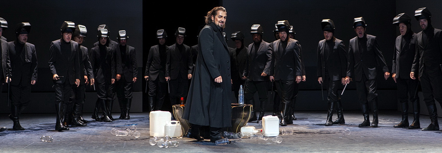 In Aachen bestimmen schlichte, gräuliche, in den Rhein-Szenen bläulich ausgeleuchtete Stellwände von Magdalena Gut die optische Grundierung. Herabwehende Plastiktüten im Rheingold und Paletten von Mineralwasserflaschen als Hort weisen auf Wagners frühe Warnung vor einer ökologischen Katastrophe als Folge eines ausschließlich profitorientierten Kapitalismus‘ im Fahrwasser der Frühindustrialisierung hin. Allerdings wirken die Fläschchen im Umfeld eines Stücks, in dem die Welt völlig aus den Fugen gerät, viel zu harmlos und willkürlich. So brav wie die gesamte Inszenierung von Johannes von Matuschka, was Personenführung und Rollenprofilierung angeht. Wobei es dem Regisseur auch nicht gelingt, Hagen besonders exponiert herauszustellen. Die Szenen werden solide nachgespielt, wobei angesichts der problematischen Verknüpfungen der Szenen Entwicklungen, Steigerungen und Höhepunkte, die Wagner mit seinem sicheren Bühneninstinkt und seinem blitzgescheiten Intellekt effekt- und sinnvoll steuerte, an Wirksamkeit verlieren oder gänzlich verpuffen.