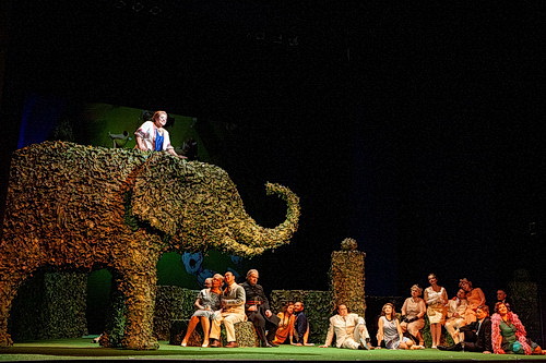 Die Ausstattung löst manchen Szenenbeifall aus. Vor allem ein überdimensionaler, aus einer Hecke geschnittener Elefant, auf dem Hanna, die „Lustige Witwe“, das Vilja-Lied singt, scheint zu entzücken. Es ist eine bunte, von einer Irrung in die andere stapfende Gesellschaft, die der Regisseur geschickt führt und den Chor wie auch das Ballett intensiv mit einbezieht.