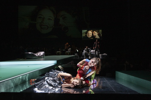 Bühnenbildner Ric Schachtebeck erweitert entsprechend die Spielfläche um einen ins Parkett ragenden Laufsteg, der auch fleißig genutzt wird. Die Bühne wird von mehreren Projektionsflächen und einigen sparsamen Versatzstücken wie einem Sofa beherrscht, was völlig ausreicht. Und es erstaunt, wie sich Engels‘ aktualisierte Werksicht der Musik anpasst, ohne auch nur ansatzweise aufgesetzt oder gar entstellend zu wirken. Selbst die ans Absurde grenzenden Fantasy-Kostüme von Raphael Jacobs, der mit verschiedenen Materialien in bizarren Kombinationen spielt, fügen sich dem Konzept ein.