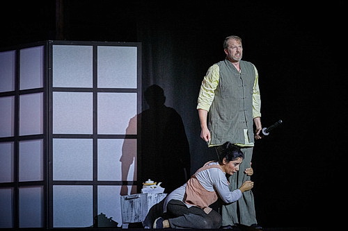 Regisseur Florian Zwipf-Zaharia erzählt die kompli­zierte und tragische Geschichte mit überzeu­gender Schlichtheit. Er lässt die Sänger mit angedeu­teter japani­scher Haltung, Bewegung und Gestik die mensch­lichen Emotionen inter­pre­tieren, die im Rahmen der brutalen, feudalen Ausein­an­der­setzung der epischen Handlung sonst leicht verloren gingen. Bühnen­bildner Thomas Bruner baut dafür einen Raum, der mit Scheren­schnitten von Kirsch­blüten eine heile Welt darstellt. Mit der Wendung der Geschichte verschwinden die Blüten und es bleibt die Öde der harschen Realität. Die Kostüme von Tatjana Sanftenberg stellen eine Brücke zwischen Tradition und Moderne dar.